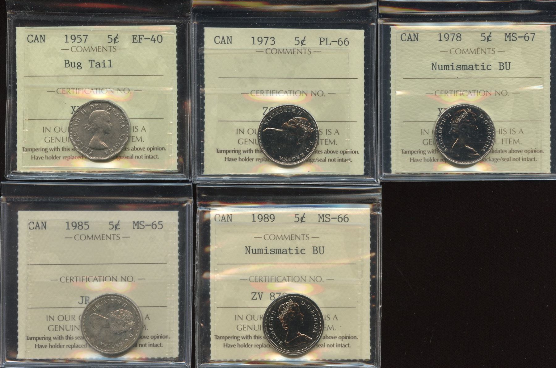 Includes: 1957 EF-40, bug tail. 1973 PL-66. 1978 MS-67, NBU. 1985 MS-65. 1989 MS-66, NBU. 5 Pcs.