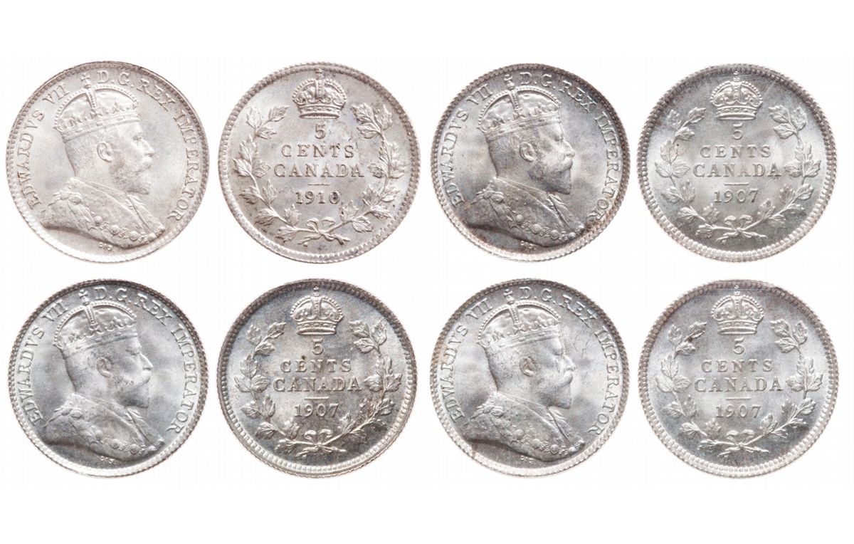 Five Cents Silver Lot. 1907. ICCS Mint State-65. Brilliant and lustrous; 1907. ICCS Mint State-65. Brilliant and Lustrous. Frosty fields. 1907. ICCS Mint State-65. Brilliant; 1910. Pointed Leaves. ICCS Mint State-65. Brilliant and lustrous. Lot of four (4) Gems.