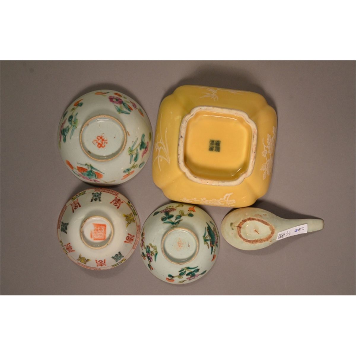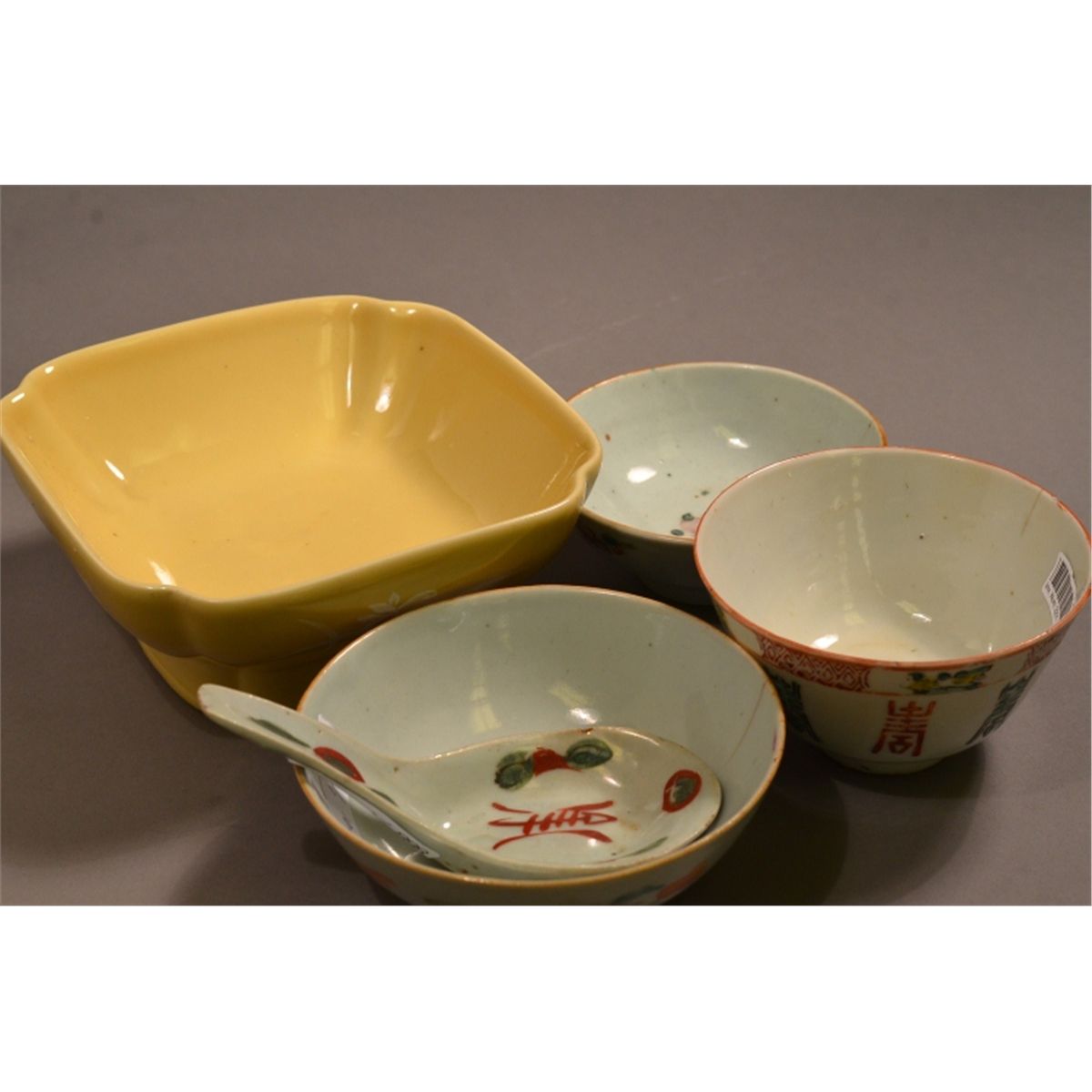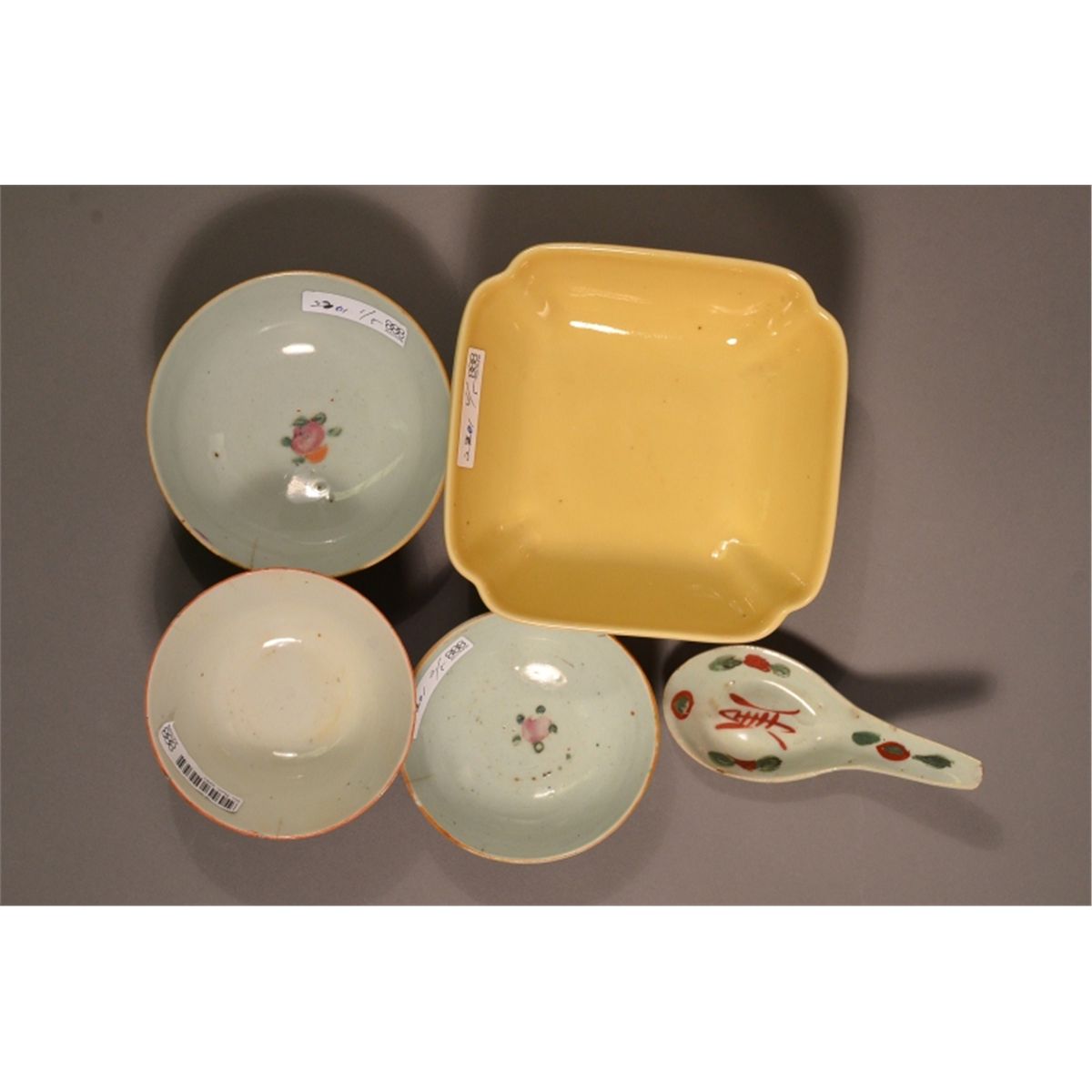 Five piece Chinese Famille Rose enameled porcelain bowls; with spoon; four-character Qing Mark and of the Period; various sizes