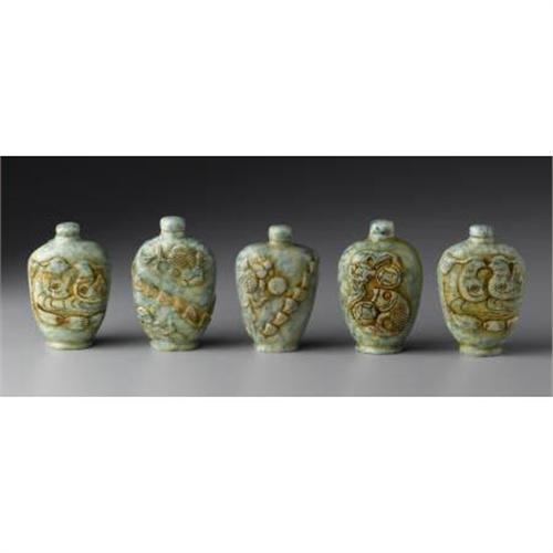 <B>Five Chinese Snuff Bottles<BR></B></I><BR>Five Chinese carved jade/hardstone snuff bottles; two of ducks and bat; two of koi; and one of carp, bat and gourds<BR>2-5/8in. high<BR><BR> <B>Condition Report:</B> Stoppers are loose in bottles, they do not fit snugly.<BR><BR><b>Shipping:</b> Bottles, Jars & Containers (<a target="_blank" href="http://www.heritageauctions.com/common/shipping.php">view shipping information</a>)