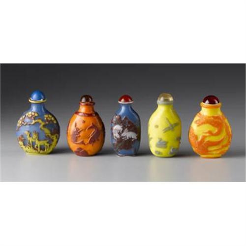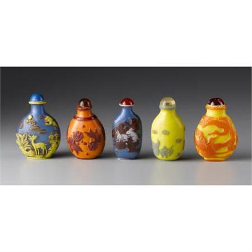<B>Five Chinese Snuff Bottles<BR></B></I><BR>Five Chinese carved overlay glass snuff bottles; yellow and red deer and crane in a landscape on blue ground, signed; red carp on an orange ground; white and red rabbits and foliage on blue ground, signed; celadon designs of water fowl and carp on yellow ground; and orange designs of cranes on yellow ground<BR>3in. high<BR><BR> <B>Condition Report:</B> Minor chipping to stopper of one bottle.<BR><BR><b>Shipping:</b> Bottles, Jars & Containers (<a target="_blank" href="http://www.heritageauctions.com/common/shipping.php">view shipping information</a>)