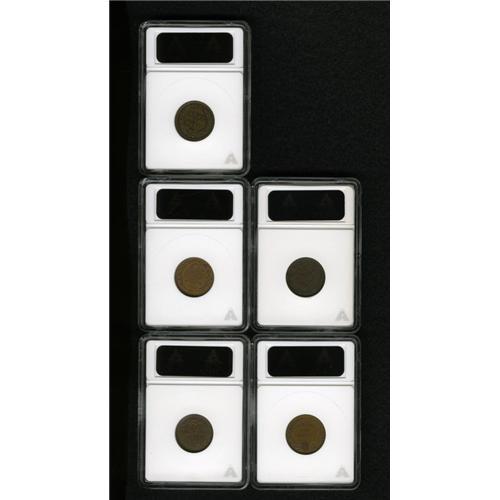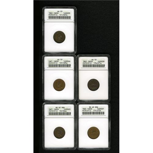 <B>Undated Our Navy MS60 Brown ANACS,</B></I> Fuld-53/336a, sharply struck, reverse horizontal die break at 9 o'clock; <B>Undated Andrew Jackson AU50 ANACS,</B></I> Fuld-137/395a, bluntly struck but unmarked, light tan-gold toning; <B>1863 Geo. B. McClellan AU53 ANACS,</B></I> Fuld-141/307a, mahogany-brown patina with rose tints, minor build-up; <B>1863 First In War MS60 Brown ANACS,</B></I> Fuld-174/272a, a bold chocolate-brown piece with a rusted obverse die; <B>1863 First In War AU50 ANACS,</B></I> Fuld-176/271a, a thin mark beneath the date, a reverse cud at 1:30, rotated dies.<BR><BR><b>Shipping:</b> Coin/Currency (<a target="_blank" href="http://www.heritageauctions.com/common/shipping.php">view shipping information</a>)