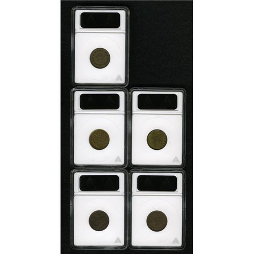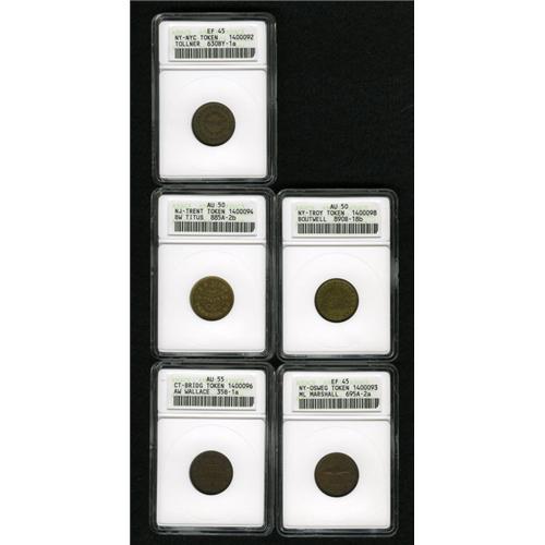 <B>Undated A.W. Wallace, Bridgeport, CT, AU55 ANACS,</B></I> Fuld-CT35B-1a, R.3, an unabraded medium brown token with a broad die break from a wing to a flagpole; <B>Undated B.W. Titus, Trenton, NJ, AU50 ANACS,</B></I> Fuld-NJ885A-2b, R.3, brassy olive and orange toning, traces of white debris; <B>Undated C. Tollner & Hammacher, New York, NY, XF45 ANACS,</B></I> Fuld-NY630BY-1a, R.3, walnut-brown patina, smooth fields; <B>1863 M.L. Marshall, Oswego, NY, XF45 ANACS,</B></I> Fuld-NY695A-2a, R.1, unblemished and evenly struck, a whisper of debris; and an <B>1863 Oliver Boutwell, Troy, NY, AU50 ANACS,</B></I> Fuld-NY890B-18b, R.1, a brassy yellow piece with some remaining luster.<BR><BR><b>Shipping:</b> Coin/Currency (<a target="_blank" href="http://www.heritageauctions.com/common/shipping.php">view shipping information</a>)