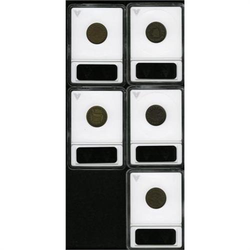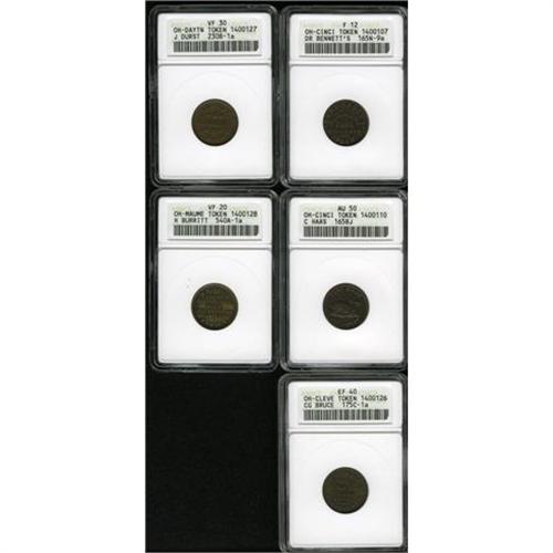 <B>Undated Dr. Bennett's, Cincinnati, OH, Fine 12 ANACS,</B></I> Fuld-OH165N-9a, R.1, moderate verdigris; <B>1863 C. Haas, Cincinnati, OH, AU50 ANACS,</B></I> Fuld-OH165BJ-24a, R.9, die breaks along the lower obverse border confirm the variety; <B>1863 C.G. Bruce, Cleveland, OH, XF40 ANACS,</B></I> Fuld-OH175C-1a, R.2, minor buildup in protected areas; <B>1863 J. Durst, Dayton, OH, VF30 ANACS,</B></I> Fuld-OH230B-1a, R.5, the reverse center is softly brought up; <B>Undated H. Burritt, Maumee City, OH, VF20 ANACS,</B></I> Fuld-OH540A-1a, R.3, the fields are olive-brown, the legends and borders display mildly granular russet patina.<BR><BR><b>Shipping:</b> Coin/Currency (<a target="_blank" href="http://www.heritageauctions.com/common/shipping.php">view shipping information</a>)