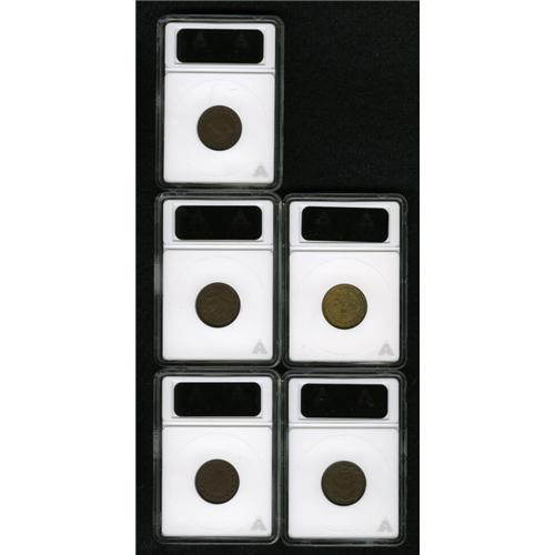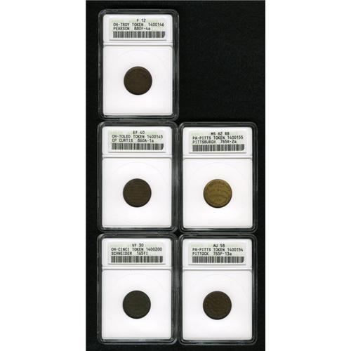<B>1863 L. Schneider, Cincinnati, OH, VF30 ANACS,</B></I> Fuld-OH165FI-2a, R.6, a smooth medium-brown piece; <B>1863 C.P. Curtis, Toledo, OH, XF40 ANACS,</B></I> Fuld-OH860A-1a, R.3, chocolate-brown with minor reverse marks; <B>Pearson & Bro, Troy, OH, Fine 12 ANACS,</B></I> Fuld-OH880F-4a, R.3, worn but obverse legends are mostly bold, date is worn smooth; <B>Undated Pittocks' Card, Pittsburgh, PA, AU58 ANACS,</B></I> Fuld-PA765P-13a, R.4, semi-prooflike, golden-brown, minor reverse marks; and a <B>Dry Goods, Pittsburgh, PA, MS62 Red and Brown ANACS,</B></I> Fuld-PA765R-2a, R.2, blended gold, lime, and tan toning, pleasing surfaces, reverse cuds at 7 and 8 o'clock.<BR><BR><b>Shipping:</b> Coin/Currency (<a target="_blank" href="http://www.heritageauctions.com/common/shipping.php">view shipping information</a>)