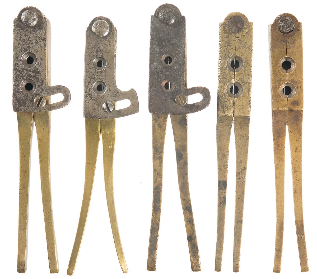 1) Colt bullet mold, 31 caliber, brass body marked "31/PKT" on the side, "COLT'S/ PATENT" marked steel cutter, 2 cavity. 2) As 1 in 36 caliber with unmarked cutter and "COLT'S/ PATENT" body. 3) As 1, in 36 caliber with unmarked body. 4) Colt mold, 31 caliber, 2 cavity, brass body marked "COLT'S/ PATENT", produced without cutter. 5) Colt mold, 28 caliber, otherwise as 4.