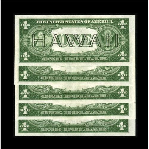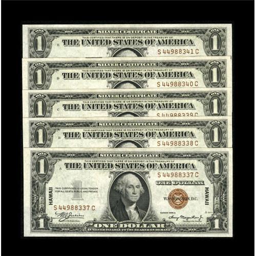 <B>Five Consecutive Fr. 2300 $1 1935A Hawaii Silver Certificates. Choice About Uncirculated.</B></I><BR> This perfectly original group shows pleasing paper quality and bold embossing, though each note has a soft center fold. The last also has a broad corner.<BR><BR><b>Shipping:</b> Coins & Currency (<a target="_blank" href="http://www.heritageauctions.com/common/shipping.php">view shipping information</a>)