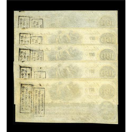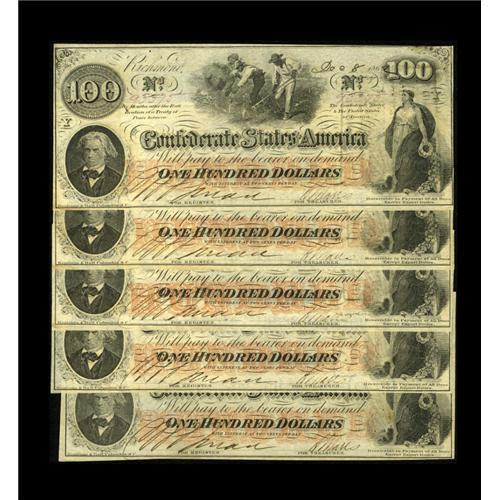 <B>Five Consecutive T-41's.</B></I> All five notes are of the Scroll 2, Printing Plate 6 variety, as described in Fricke. The first four notes have the CSA block letter watermark, designated as PF-25, while the fifth note is on plain paper, designated as PF-20. <B>Choice Crisp Uncirculated.</B></I><BR><BR><b>Shipping:</b> Coin/Currency (<a target="_blank" href="http://www.heritageauctions.com/common/shipping.php">view shipping information</a>)