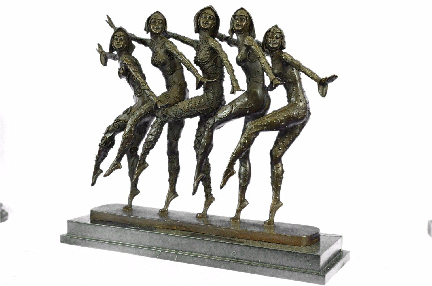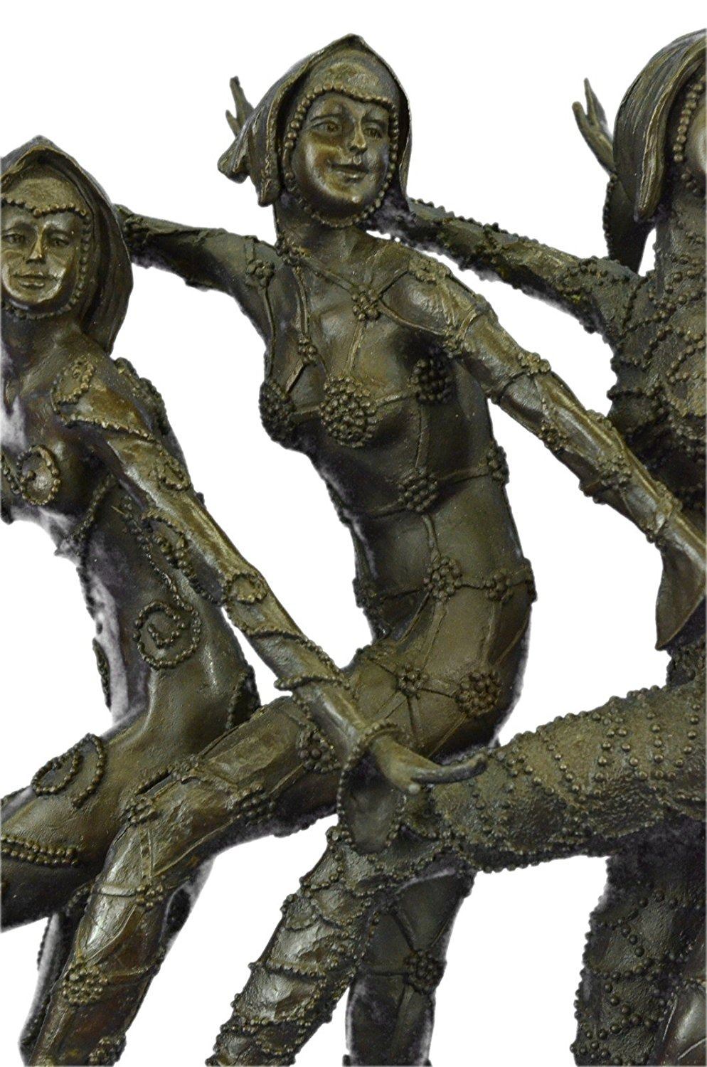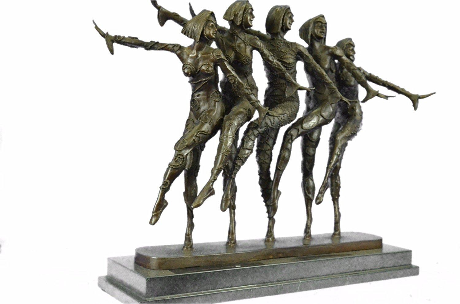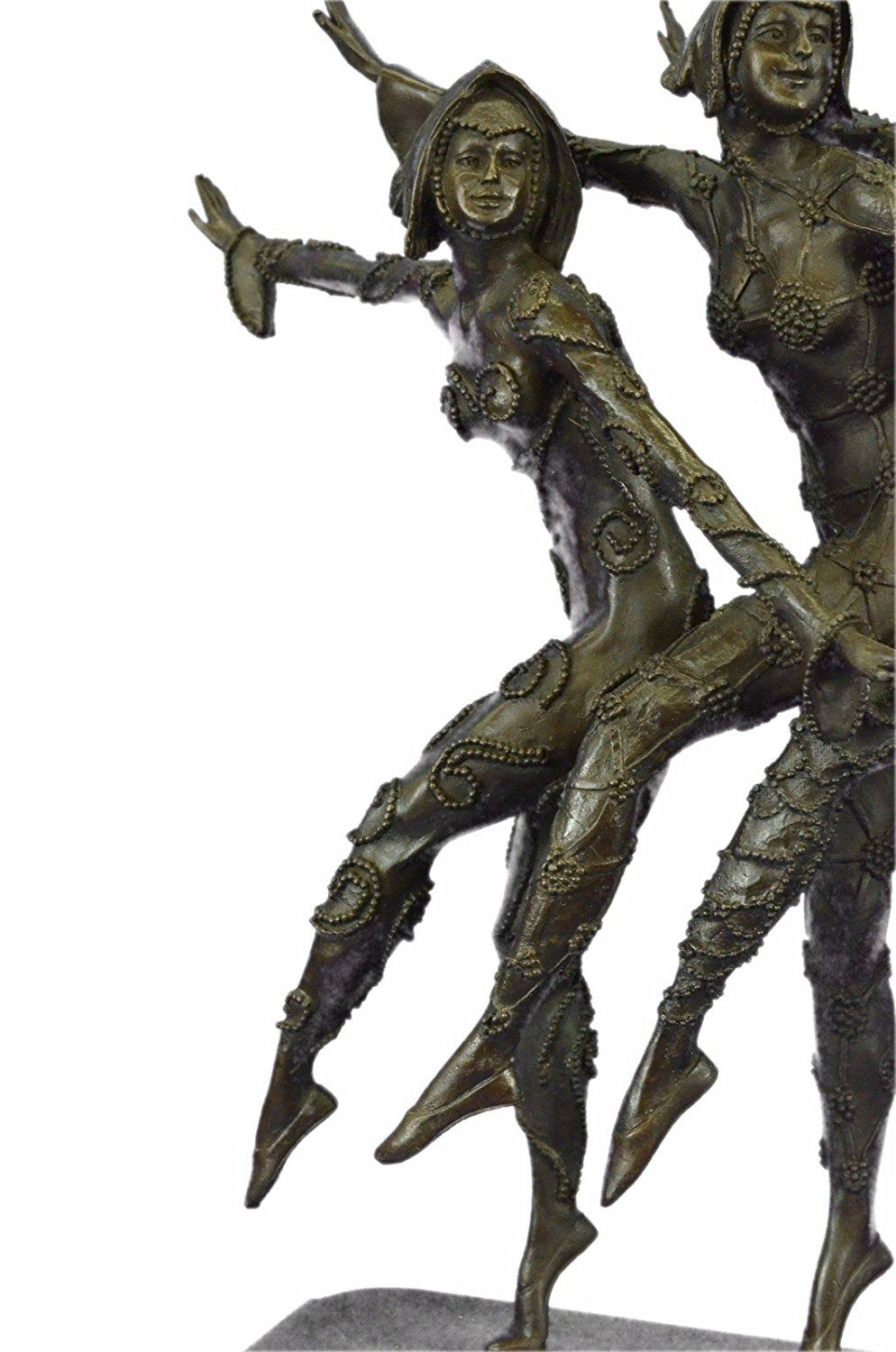 This amazing piece will go lovely in any home. These woman stand on one leg, since balancing their weight seems to come easy to them as they spreads their arms out like wings, they bend their left leg in and put on a show for the audience. These Lady Dancers wear a detail outfits in a beautiful variation, wearing also nice caps an absolute worth seeing exhibit. The result is a high impression bronze dancing sculpture. 100% bronze and handmade, brown patina sculpture was cast using the LostWax Method and its mounted on a black and fire red marble base. Bronze Dimensions with Marble Base: Height 19 X Width 22 inches. Weight: 55 LBS. Inventory: 20X202022501