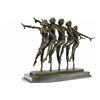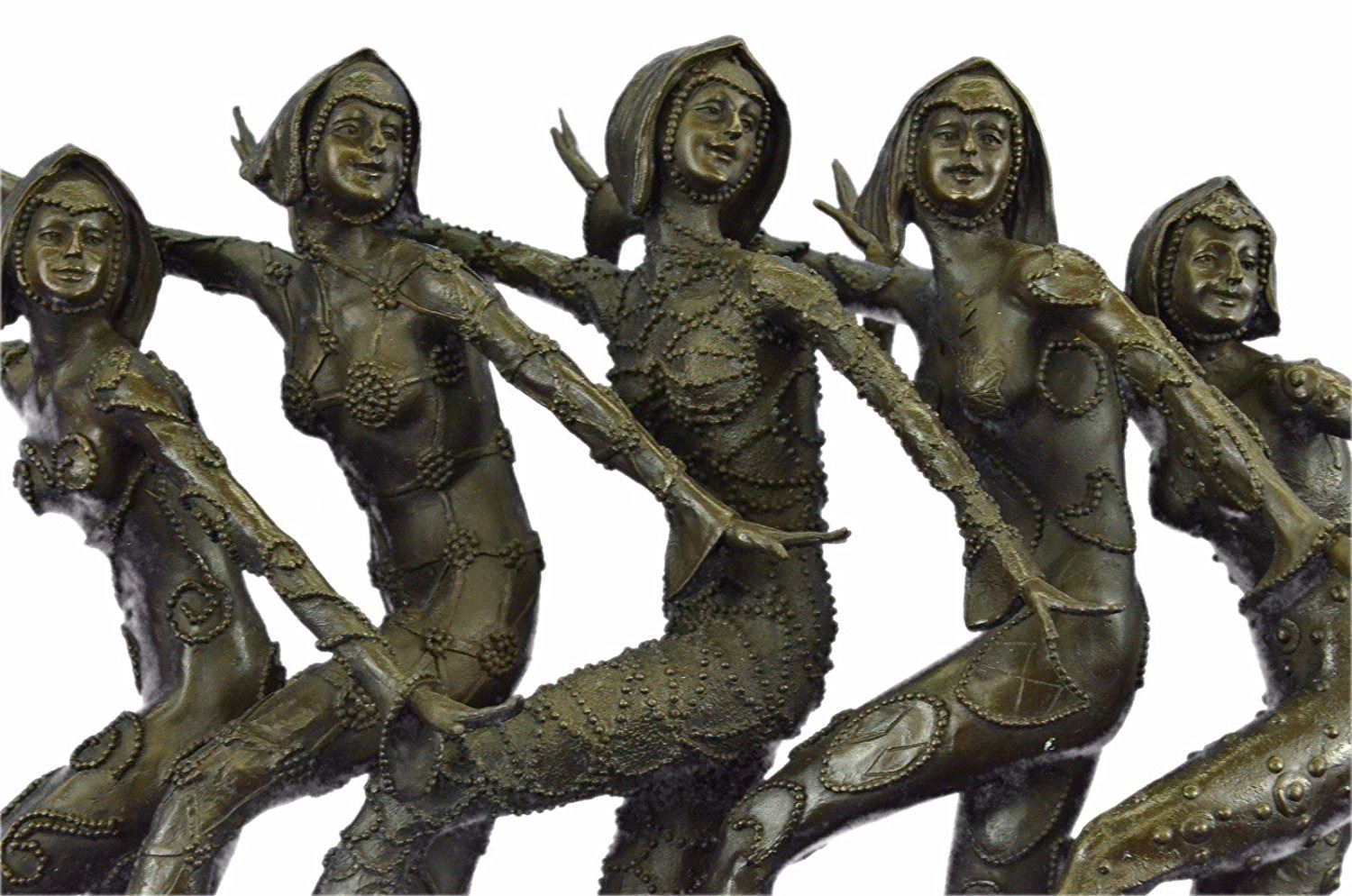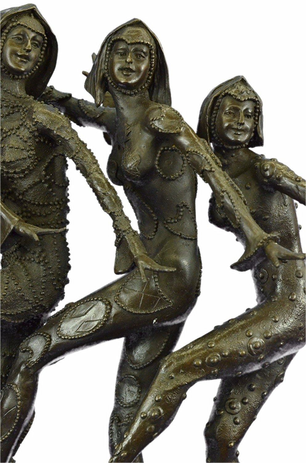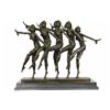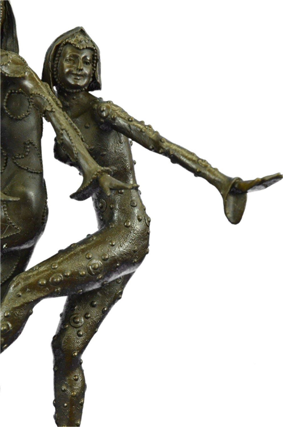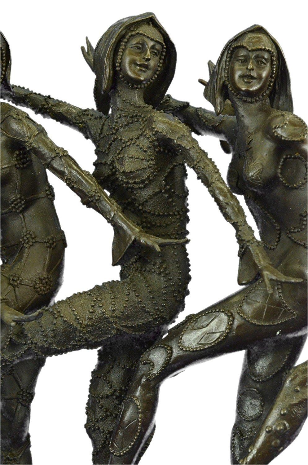 This amazing piece will go lovely in any home. These woman stand on one leg, since balancing their weight seems to come easy to them as they spreads their arms out like wings, they bend their left leg in and put on a show for the audience. These Lady Dancers wear a detail outfits in a beautiful variation, wearing also nice caps an absolute worth seeing exhibit. The result is a high impression bronze dancing sculpture. 100% bronze and handmade, brown patina sculpture was cast using the LostWax Method and its mounted on a black and fire red marble base. Bronze Dimensions with Marble Base: Height 19 X Width 22 inches. Weight: 55 LBS. Inventory: 20X202022501