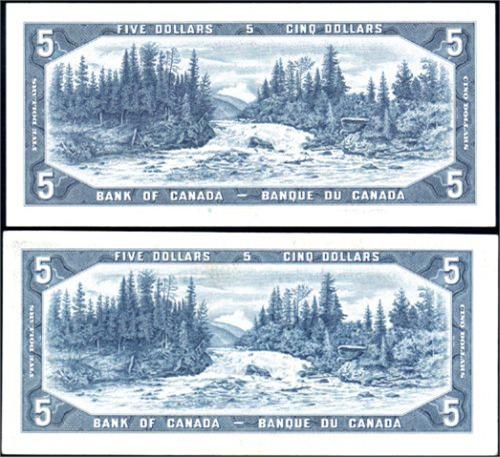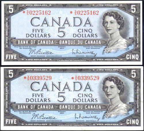 Bank of Canada Five Dollars 1954, Beattie-Rasminski, BC-39bA Serial Numbers *S/S0225162 and *V/S0339529, EF and EF+. Total of two notes