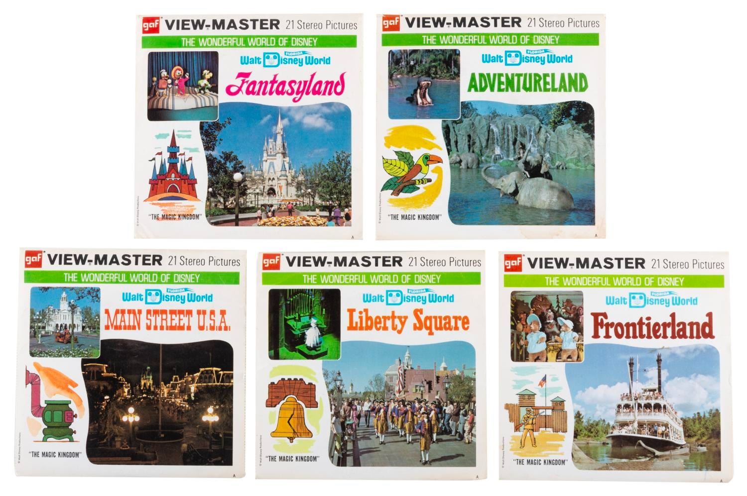 (Walt Disney World, 1970s) A collection of five View-Master packs featuring Walt Disney World's Main Street, U.S.A., Frontierland, Adventureland, Liberty Square, and Fantasyland. Each set contains 21 3D pictures. Each measuring 4.5" x 4.5", the View-Master sets are in very good condition with some split edges to the envelopes.