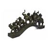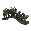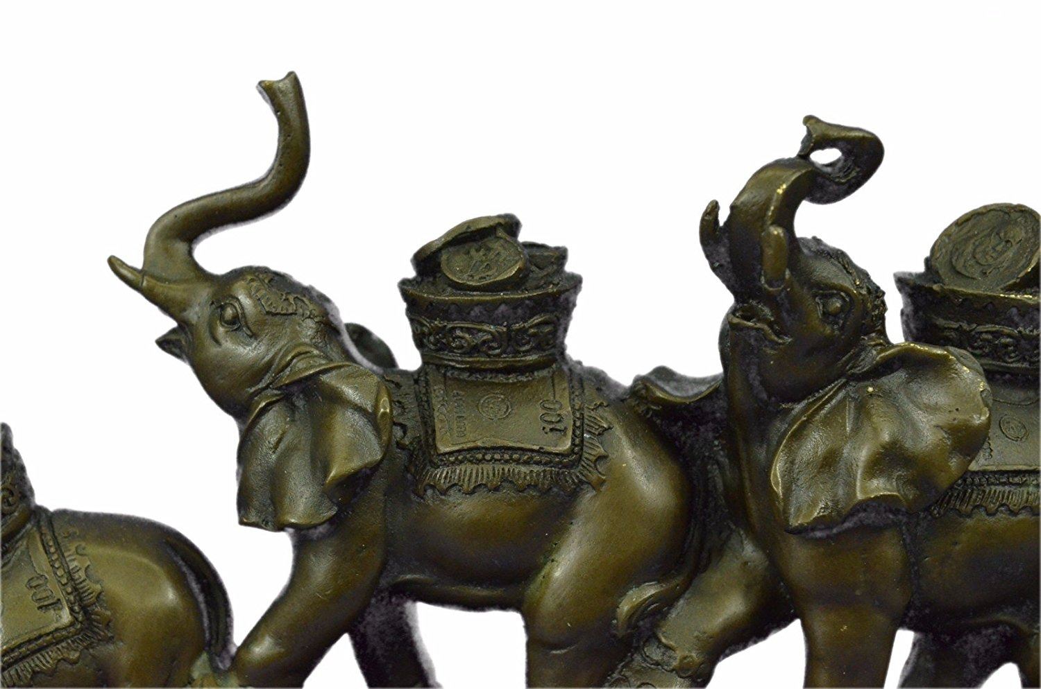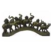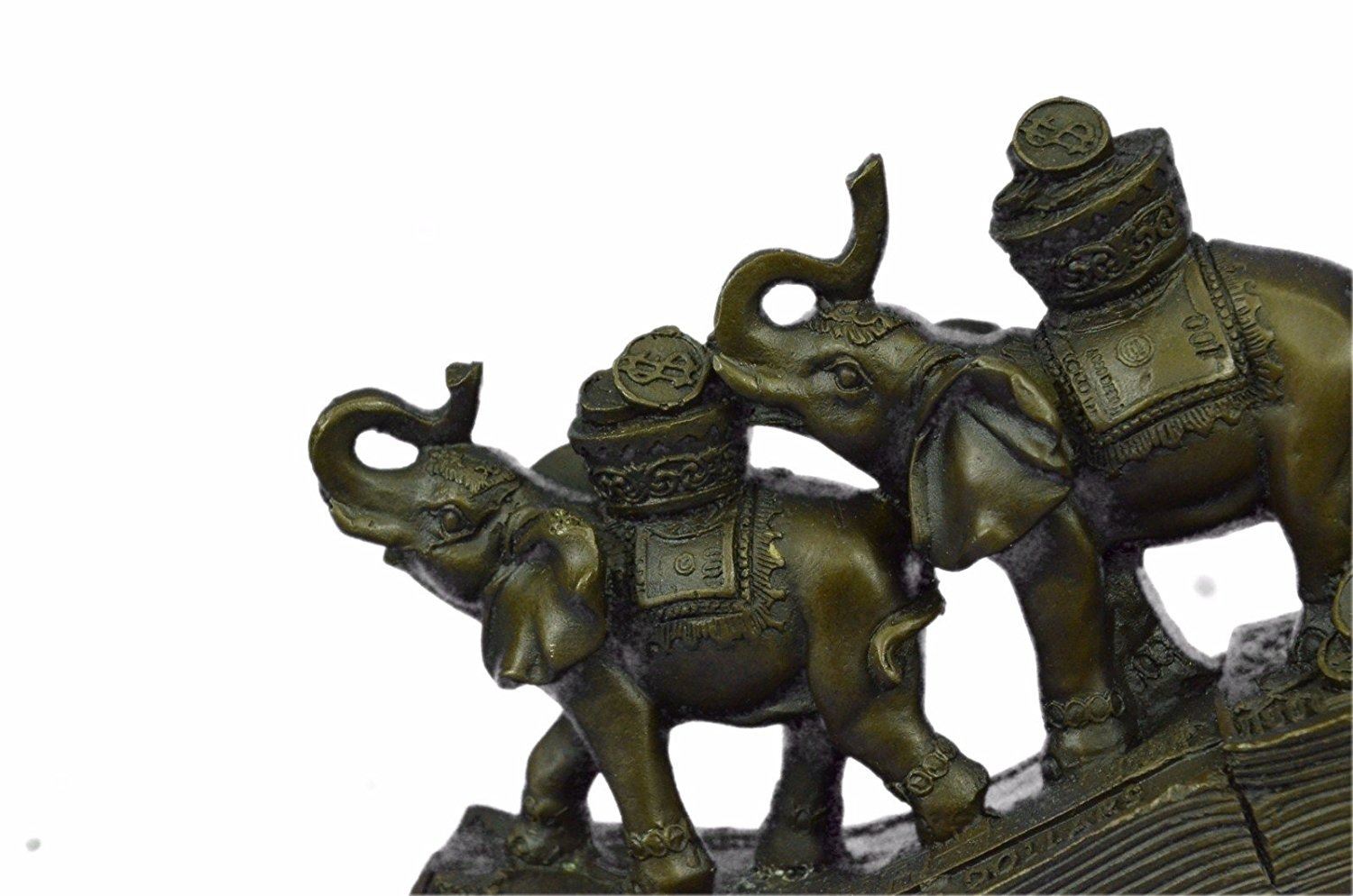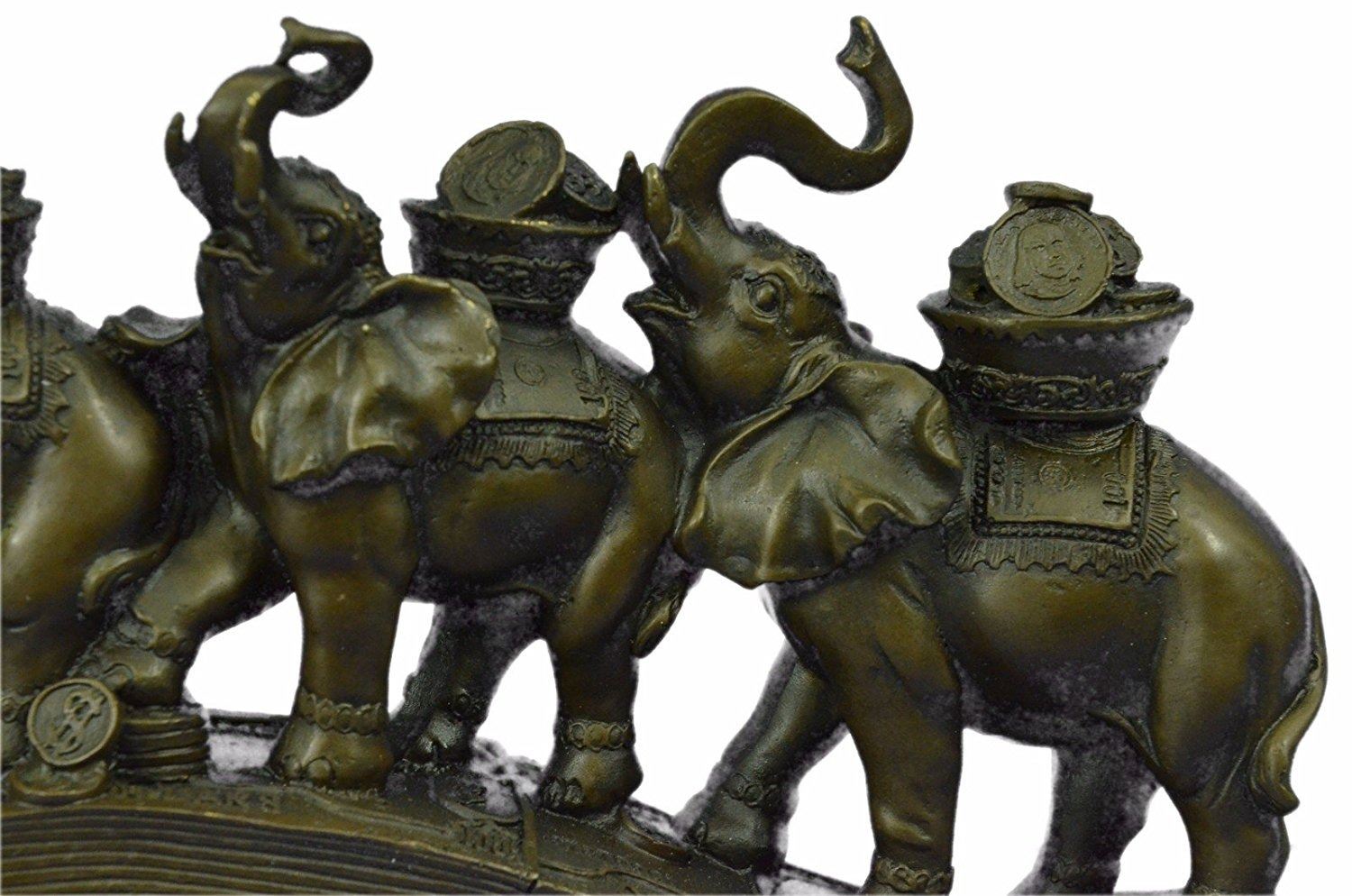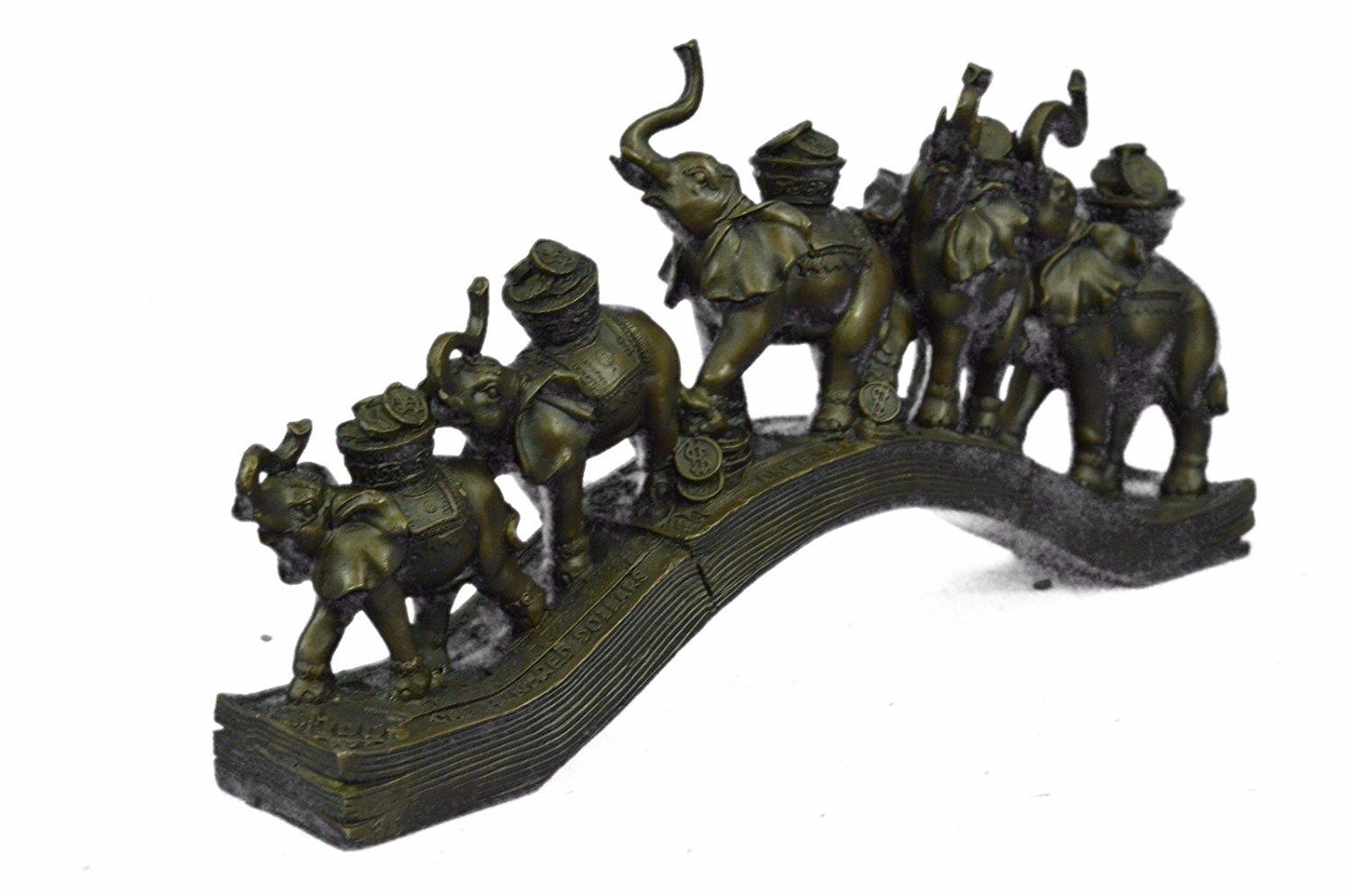 The members of an elephant clan can be imagined on the banks of a watering hole in the hot plains of Africa. Reaching the final destination after an epic migration they all trumpet their trunks into the air in reverie. For years the elephant has been known as a sacred animal in the East. As the largest animal to walk the Earth, the elephant is known as a symbol of strength and power. In Buddhist cultures, white elephants are symbolic of patience and wisdom. The Chinese see elephants as a symbol of energy, strength,wealth and power. These elephants are crossing a bridge built of stacks of hundred dollar bills bringing good luck to your home. Ganesha is a Hindu deity with an elephant's head. The handmade bronze sculpture was captured using the ancient method of lost wax casting and stained with a brown patina finish for preservation. They are mounted upon a black variegated marble base. Bronze Dimensions: Height 7 X Width 14 inches. Weight: 8 LBS. Inventory: 31YDW0736013