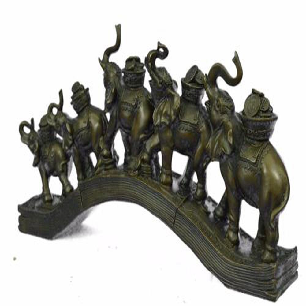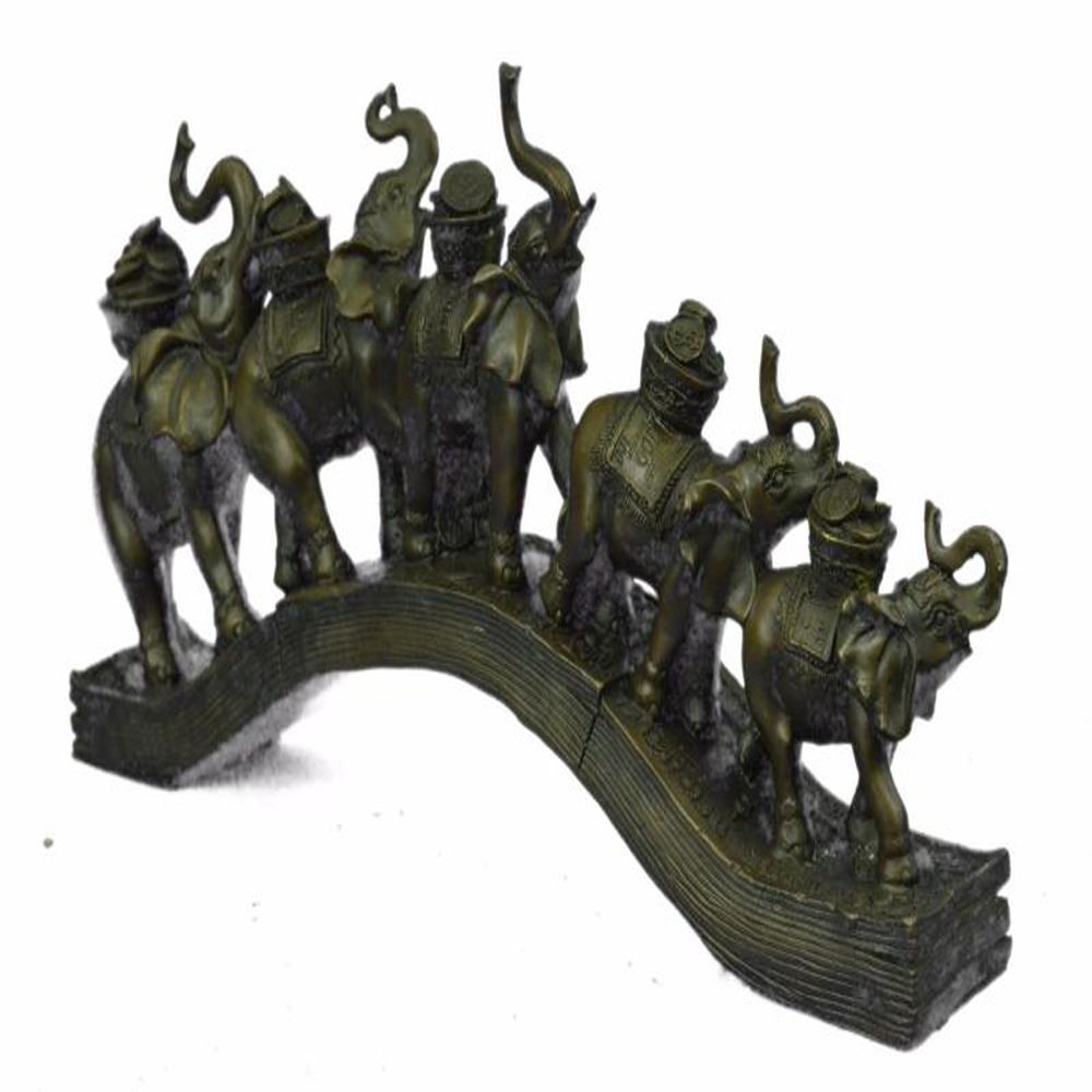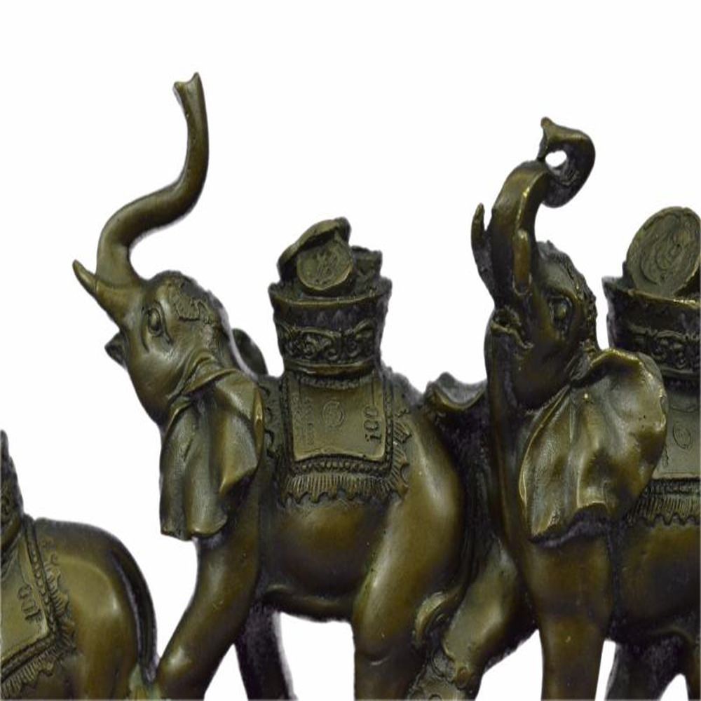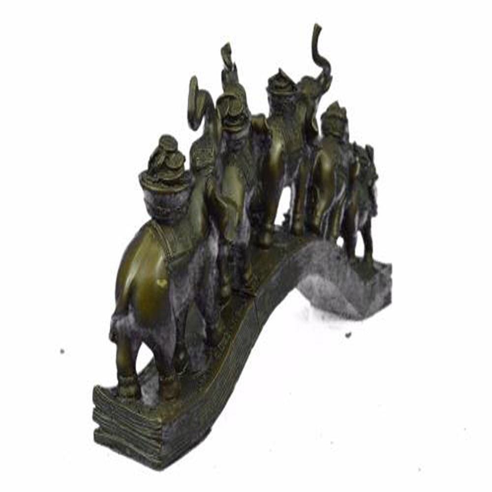 The members of an elephant clan can be imagined on the banks of a watering hole in the hot plains of Africa. Reaching the final destination after an epic migration they all trumpet their trunks into the air in reverie. For years the elephant has been known as a sacred animal in the East. As the largest animal to walk the Earth, the elephant is known as a symbol of strength and power. In Buddhist cultures, white elephants are symbolic of patience and wisdom. The Chinese see elephants as a symbol of energy, strength,wealth and power. These elephants are crossing a bridge built of stacks of hundred dollar bills bringing good luck to your home. Ganesha is a Hindu deity with an elephant head. The handmade Bronze Sculpture was captured using the ancient method of lost wax casting and stained with a brown patina finish for preservation. They are mounted upon a marble base. Bronze Dimensions: Height 7 X Width 14 inches. Weight: 8 LBS.