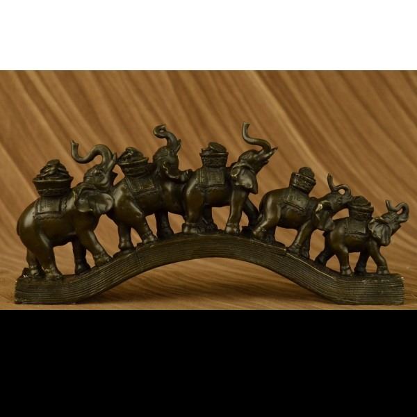 The members of an elephant clan can be imagined on the banks of a watering hole in the hot plains of Africa. Reaching the final destination after an epic migration they all trumpet their trunks into the air in reverie. For years the elephant has been known as a sacred animal in the East. As the largest animal to walk the Earth, the elephant is known as a symbol of strength and power. In Buddhist cultures, white elephants are symbolic of patience and wisdom. The Chinese see elephants as a symbol of energy, strength,wealth and power. These elephants are crossing a bridge built of stacks of hundred dollar bills bringing good luck to your home. Ganesha is a Hindu deity with an elephant's head. The handmade bronze sculpture was captured using the ancient method of lost-wax casting and stained with a brown patina finish for preservation. They are mounted upon a black variegated marble base Condition: This sculpture is in perfect condition. Bronze Dimensions :Height 7" x Width 14" Weight : 8 LBS Inventory : 31YDW0736013
