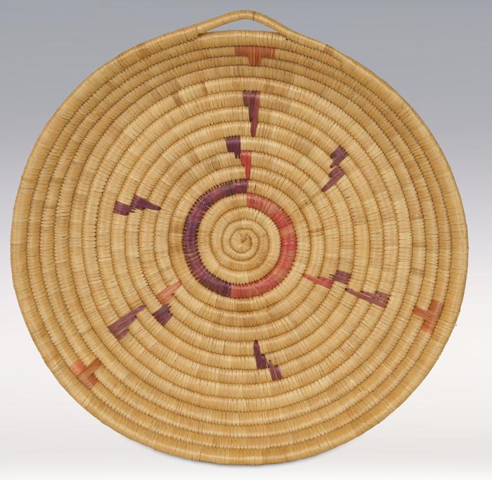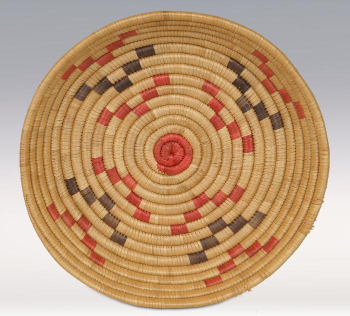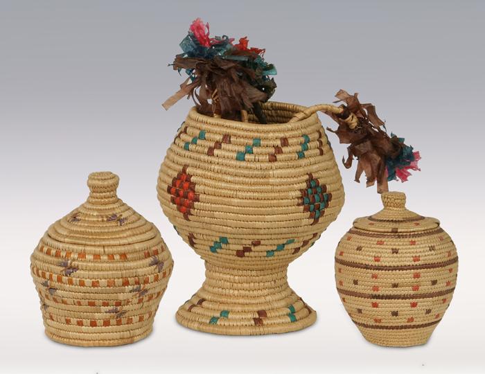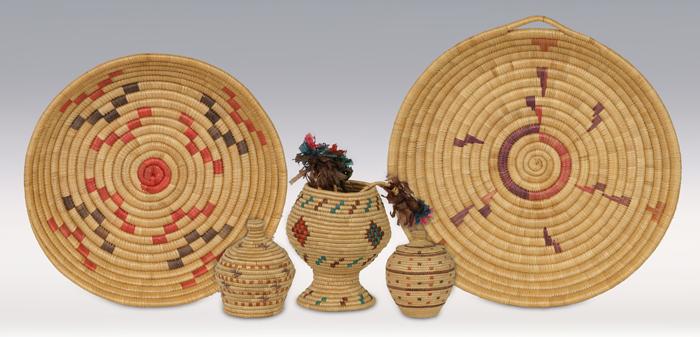 Five Eskimo Baskets. (1) 13" tray. (2) 14 1/2" tray. (3) Basket with lid 4 1/2" (4) Basket with Lid, 4 1/4". (5) Basket with Flowers, 6". Condition Report: All in good condition. Minor stitch loss.