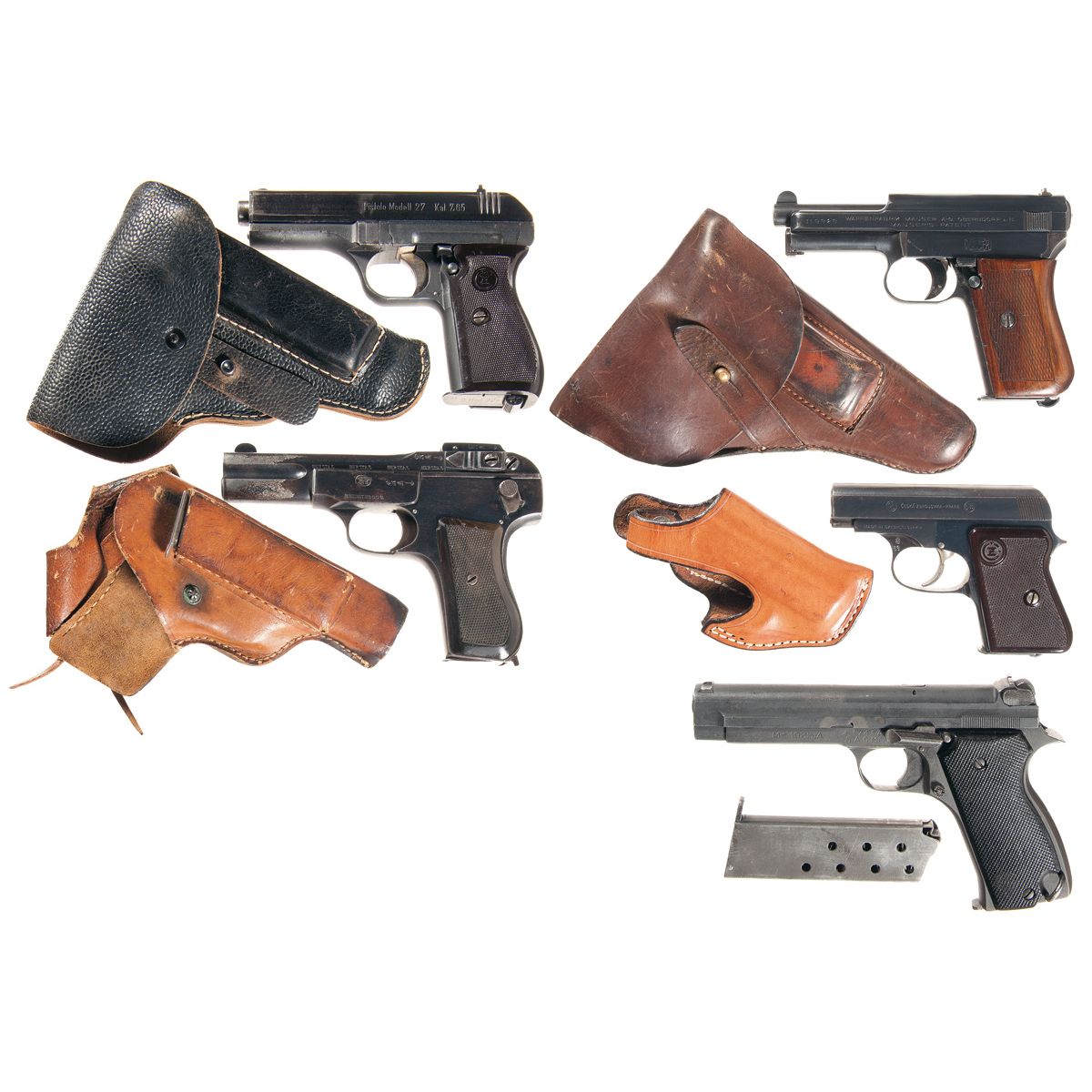 With altered leather holster and two magazines total.
