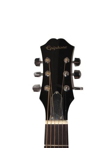 Screen used, hero, brown wood "Epiphone" Model Number PR-150NA guitar and guitar strap. (approx. 48" long) Note: oversized item, will require additional shipping charges.