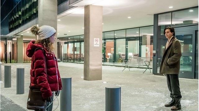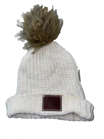 Stella (Haley Lu Richardson) screen worn, hero, off-white, cream colored "Love Your Melon" beanie with grey pom pom on top.
