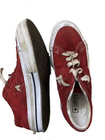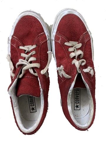 Stella (Haley Lu Richardson) screen used, red suede "Converse All Star, Chuck Taylor" with white soles (size womens 6). Includes wardrobe tag that reads: "Stella".