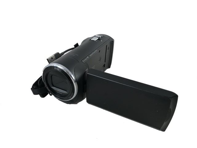 Stella (Haley Lu Richardson) screen used, hero, black "Sony HDR-CX405 Handycam" camcorder with power cords and black stand. (approx. 6" x 3 1/2")