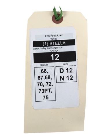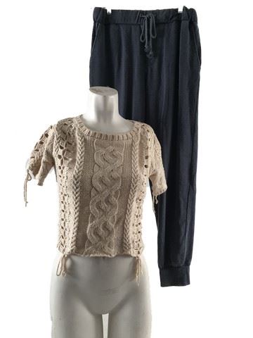 Stella (Haley Lu Richardson) screen worn, hero, cream crochet short sleeve 'Knits; top, (size XS) and dark navy 'Public Opinion' bottoms. (size M) Includes wardrobe tag.
