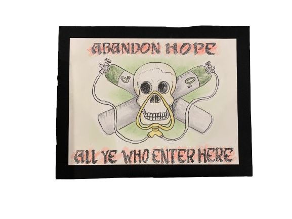 Will (Cole Sprouse) screen used, hero drawing that was taped up to the hospital room door. Features a skeleton with a hospital mask and oxygen tanks. Text reads: "Abandon Hope" "All Ye Who Enter Here" (10"x14")