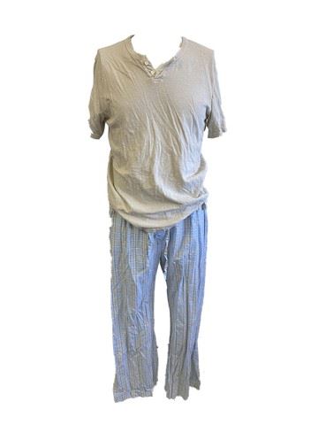 Will (Cole Sprouse) screen worn, hero, "Joes Collection", off white, henley t-shirt (size M) and "Austin Clothing Co" baby blue plaid pajama pants (size L). Wardrobe tag included. Worn in the scene labeled "pudding".