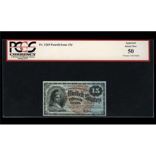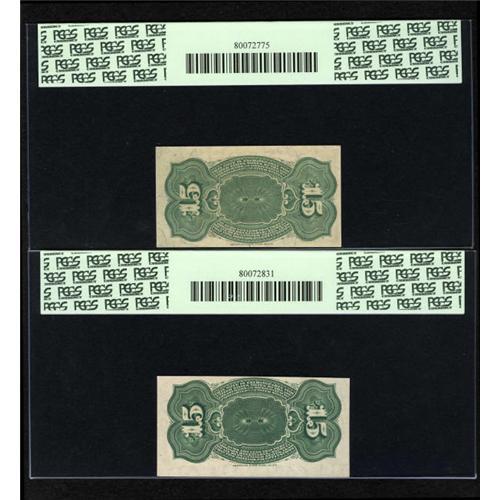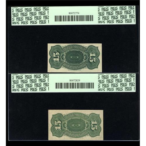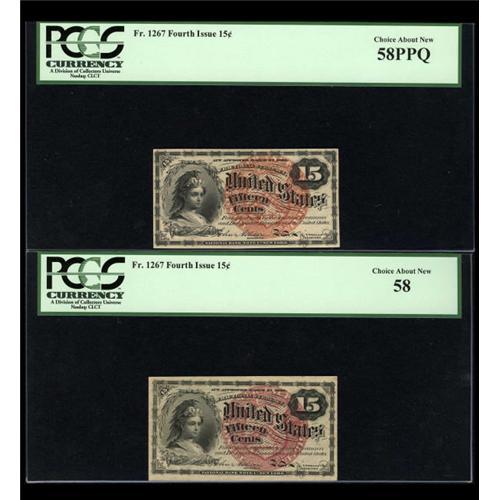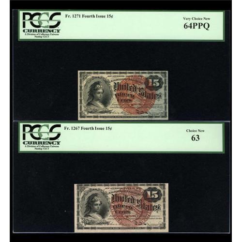 <B>Five Fifteen Cent Fourth Issue Notes.</B></I> <B>Fr. 1267 Fifteen Cent</B></I> Watermarked Paper (three notes) <B>PCGS</B></I> <B>63</B></I>, <B>PCGS</B></I> <B>58PPQ </B></I>and <B>PCGS</B></I> <B>58</B></I>.<B> Fr. 1269 Fifteen Cent </B></I>Large Seal Blue End <B>PCGS</B></I> <B>Apparent 50 </B></I>Treasury Seal Faded, and <B>Fr. 1271 Fifteen Cent </B></I>Smaller Seal <B>PCGS 64PPQ</B></I>.<BR><I>From The Thomas M. Flynn Collection</B></I><BR><BR><b>Shipping:</b> Coins & Currency (<a target="_blank" href="http://www.heritageauctions.com/common/shipping.php">view shipping information</a>)