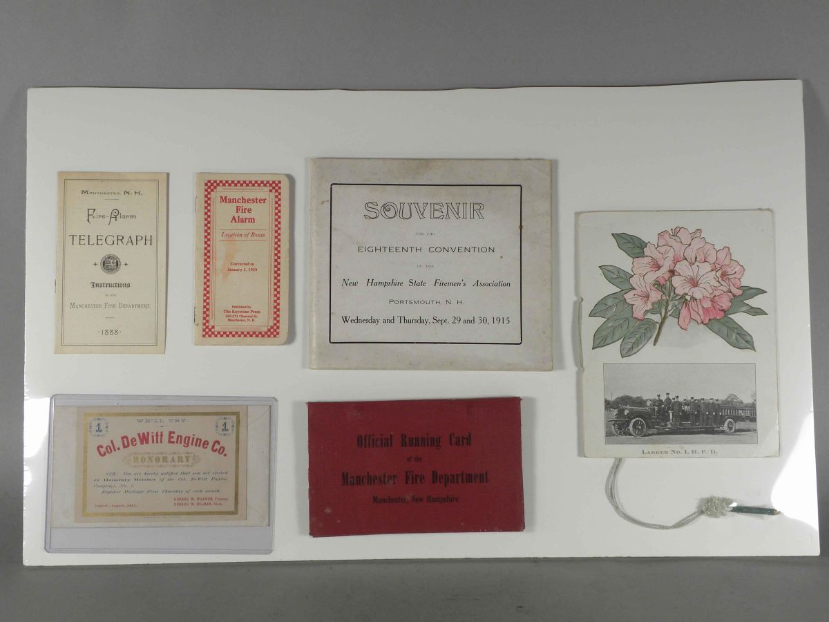 Lot of 6 Fire Related Ephemera items including two Manchester Fire Alarm instructions and locations, souvenir of 18th Convention Portsmouth, NH. Official Running Card of the Manchester Fire Department, Ladder No. 1 H.F.D. and Col. DeWitt Engine Company Honorary Member Card. Various sizes and conditions.