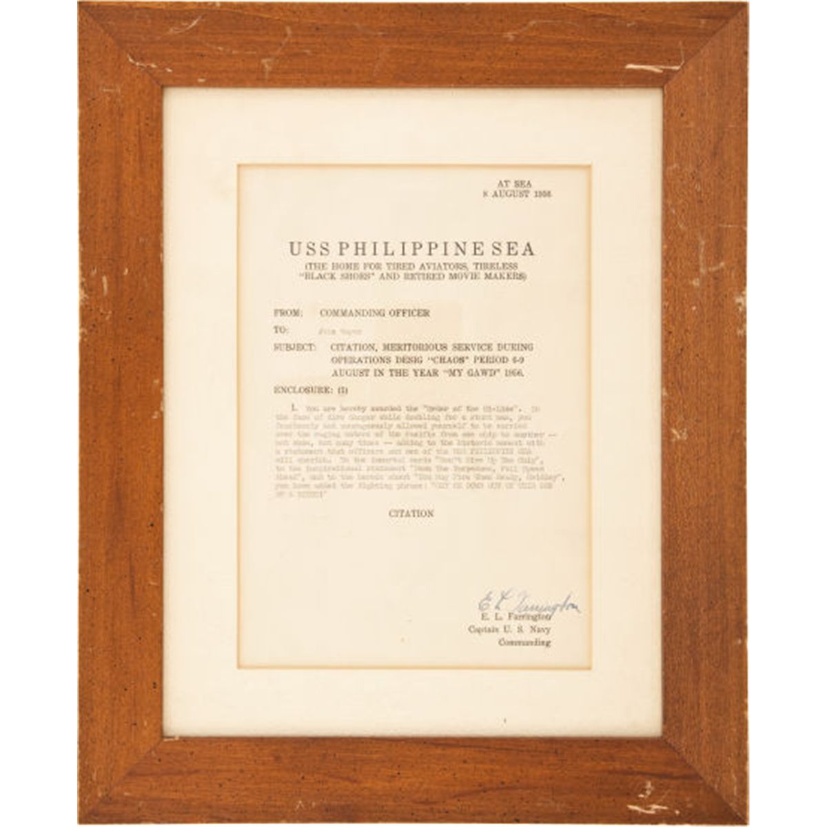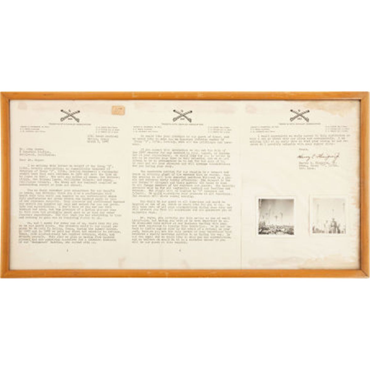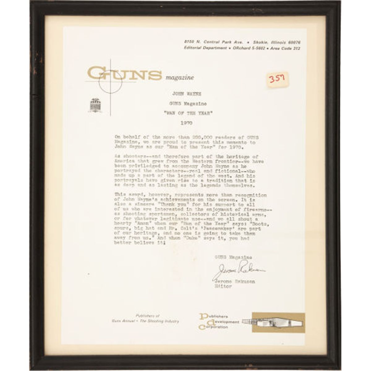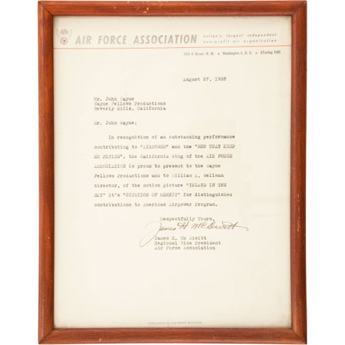 Five Framed Letters, 1940s-1970s. All written to John Wayne; including: 1) a 1947 typed letter from a soldier from Troop G-112th Cavalry Association; 2) a 1953 typed letter from the VP of the Air Force Association; 3) a 1956 memo from the Captain of the U.S. Navy; 4) 1970 typed letter from Guns Magazine; and 5) a 1977 handwritten letter from a man associated with USS Oliver Hazard Perry FFG-7; most with JW inventory stickers. (Please go to our website to see images of other pieces.)Framed: 22" x 11" and smaller