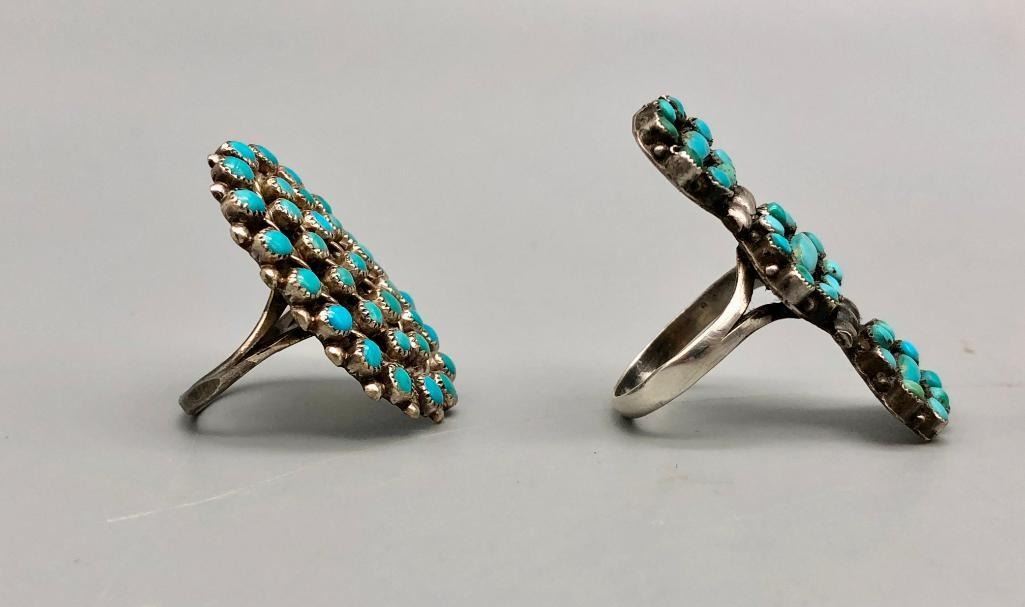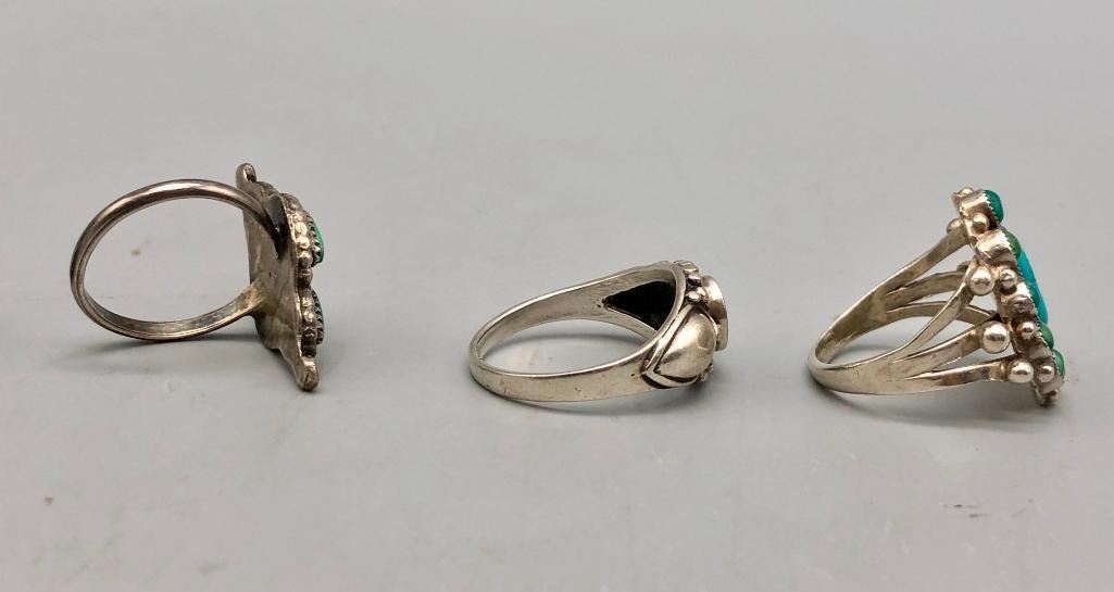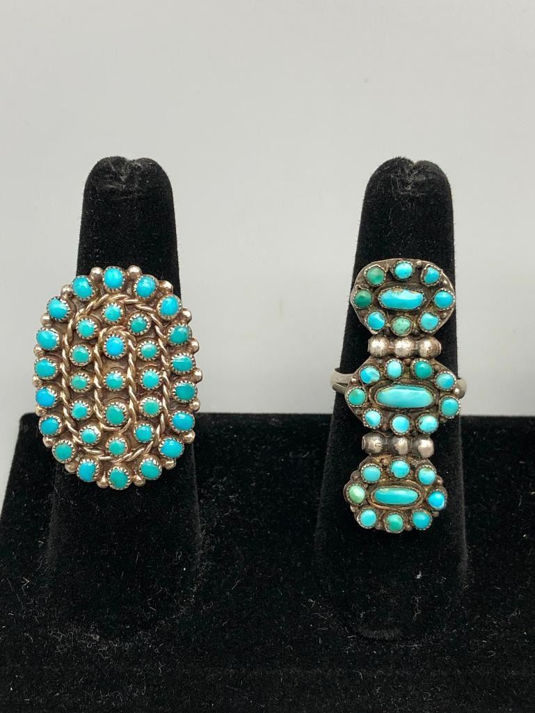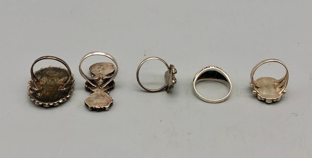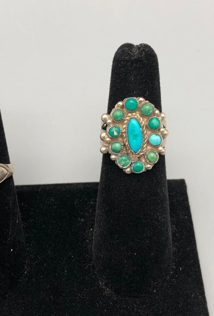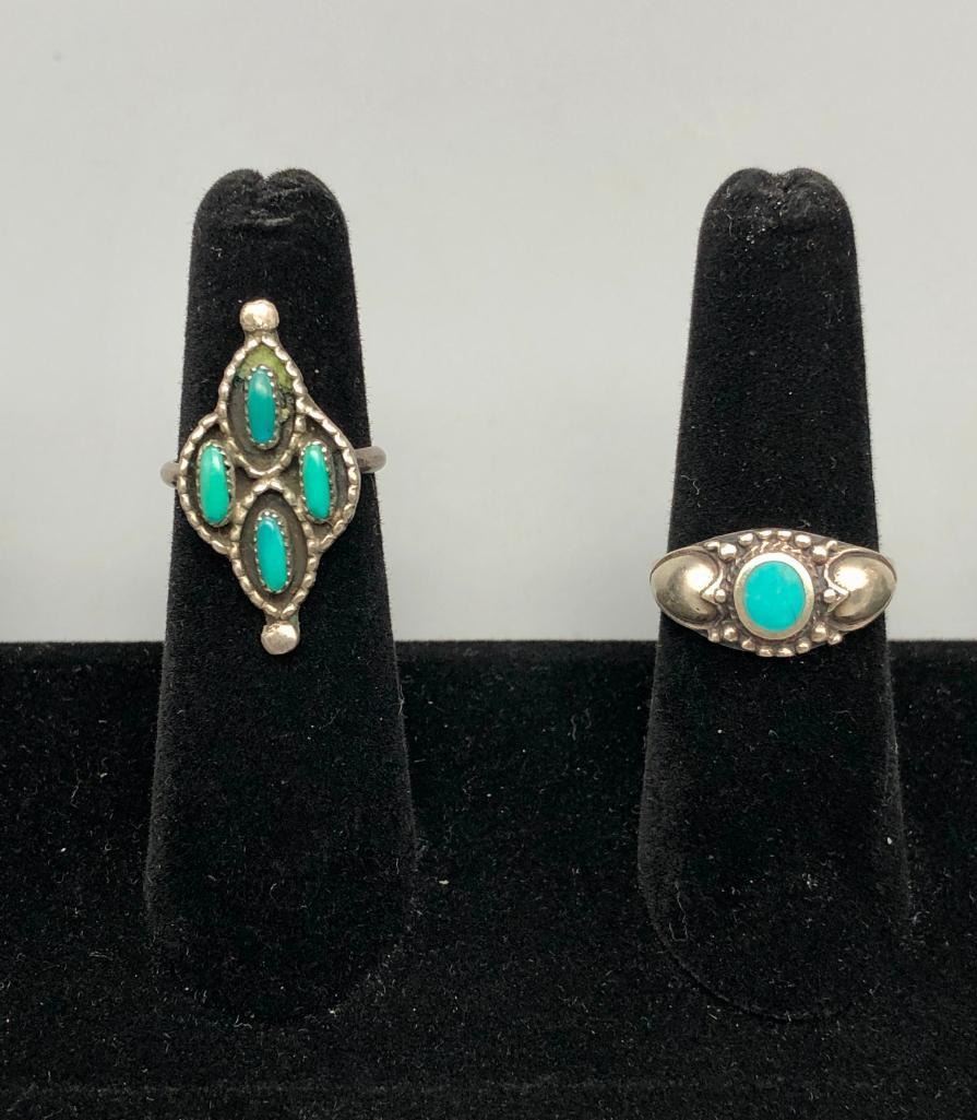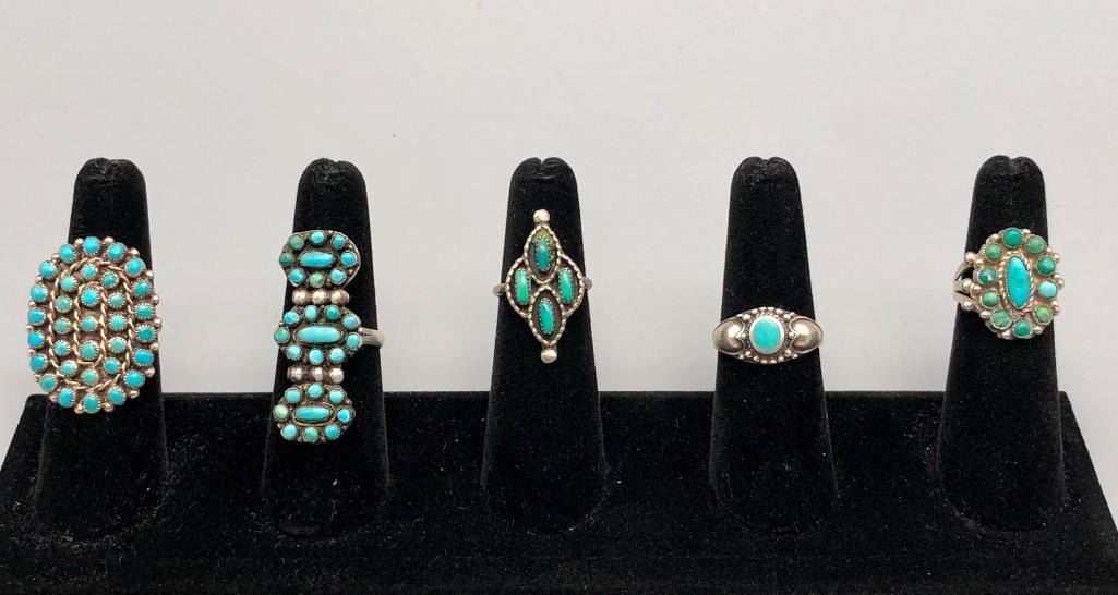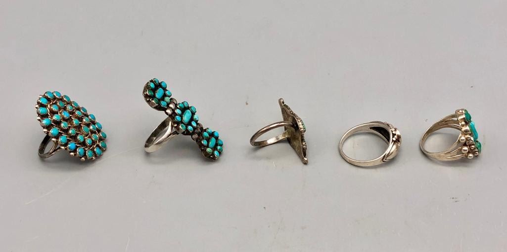 Offered for sale in this lot is a group of five, fun vintage turquoise rings. All are set with turquoise stones. They are various sizes, styles, and made from sterling silver. MAKER: Unmarked. APPROX AGE: Vintage. SIZE: Sizes range from 6-8. Weighs 26.4 grams. CONDITION: Good for their age, normal wear expected. Please look closely at the pictures as they are an important part of our description and are hereby incorporated into the description, specifically with regards to condition. SHIPPING: There will be a $5 handling / packaging fee for shipping this lot. The actual cost of postage will be added on top of that. BUY IT NOW: If you would like to buy this item now, without waiting for the auction day to bid on it, we do offer this option (which is available up to 48 hours before the actual auction starts). The “Buy it Now†price is the high estimate of this lot (plus applicable fees and the Buyer's premium is discounted to 10% when using the Buy it Now option). If you would like to exercise this option, you must contact us by email (or phone as long as you talk to someone live). Reference this lot number and your intention to "Buy it Now."