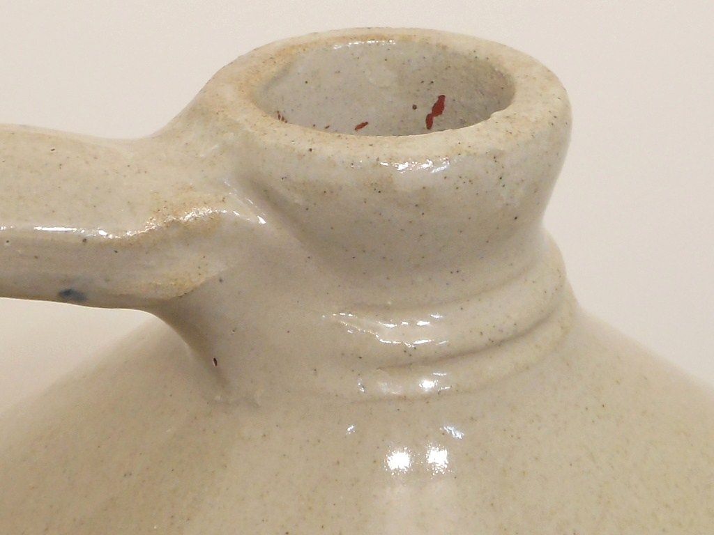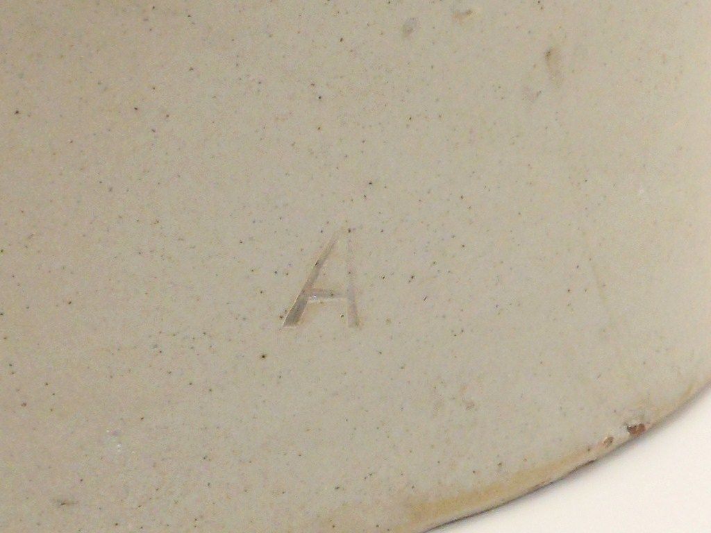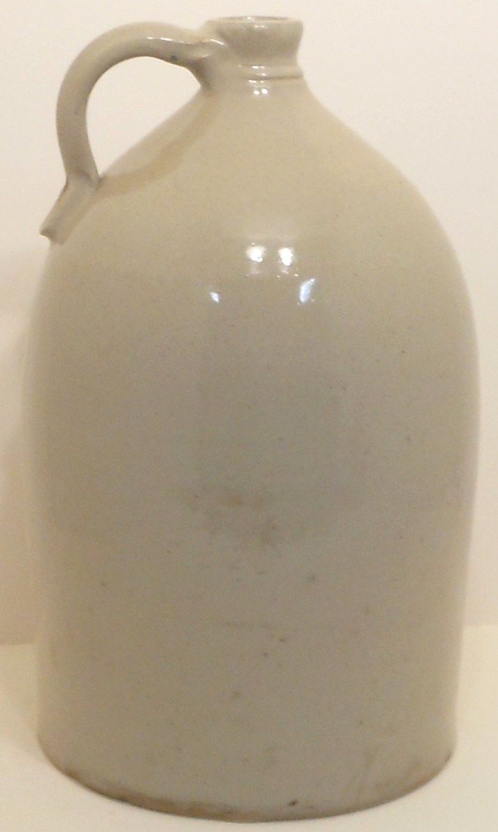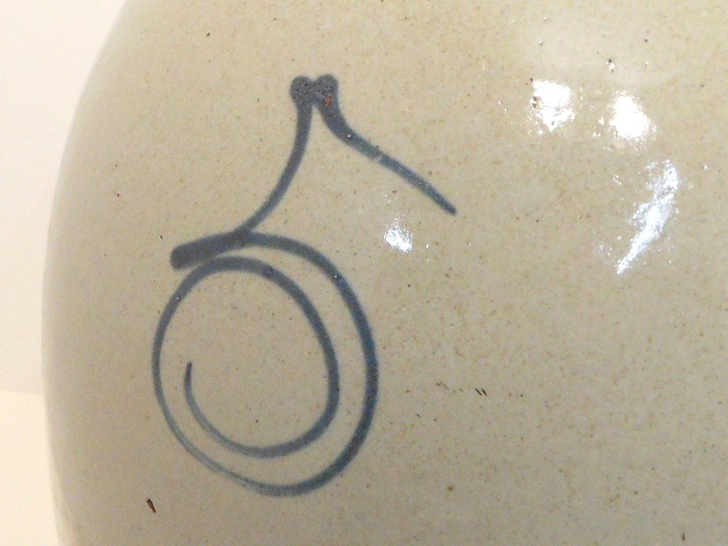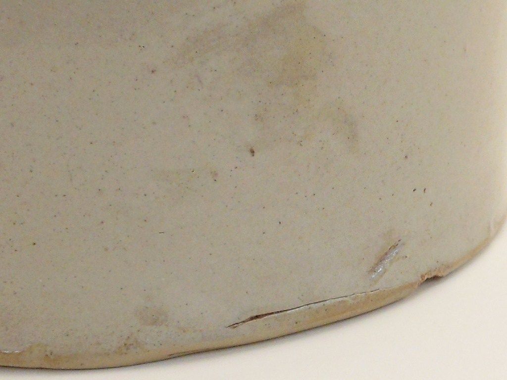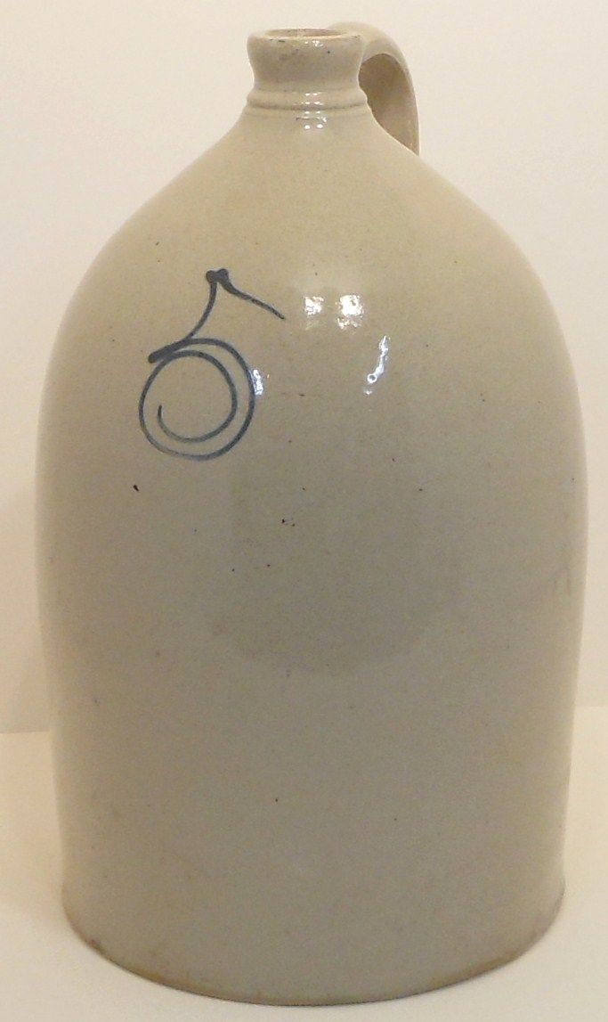 19" tall x 11 1/2" diameter, high gloss zinc glaze, marked "5", strap handle. Excellent condition with a few small basal chips.