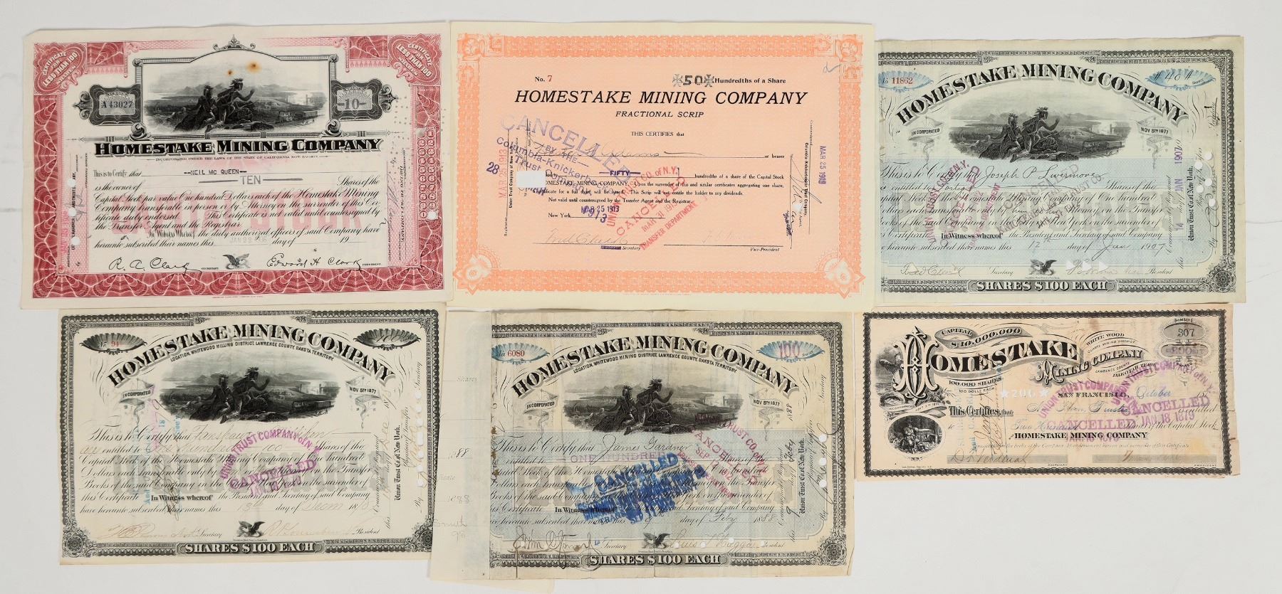 Lot of 6. Company inc. in November 1877. This group represents five different generations of leadership, plus a fractional share certificate. Includes: 1878 signed by vice president Thomas Bell (who was also associated with V&T and Bank of California), very rare; 1878 signed by vice president Lounsbery; 1888 signed by Louis Haggin, son of JB Haggin; 1907 signed by vice president Gorman; 1936 signed by president Edward H. Clark; and 1913 fractional scrip certificate. Instant collection for this very important South Dakota mine!