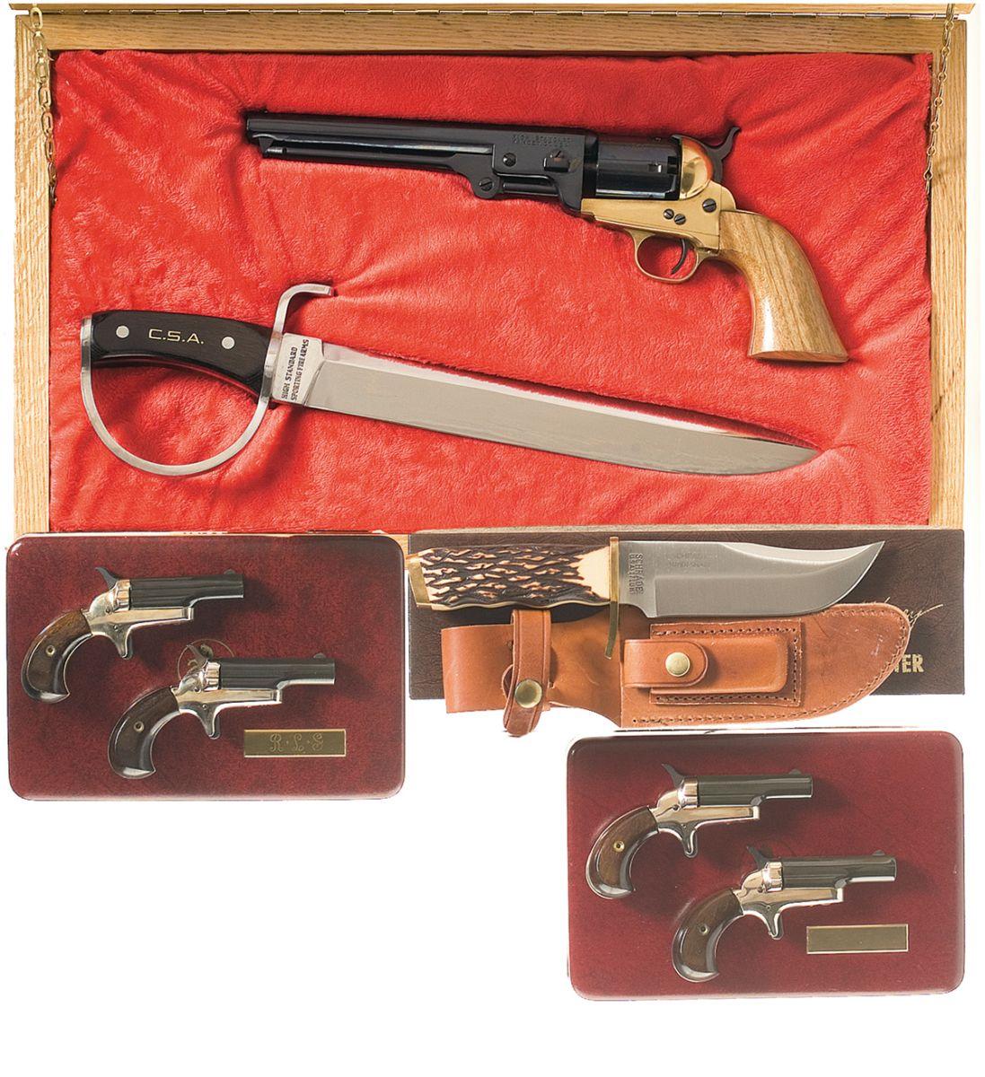 A) Standard markings and features. In hardwood case with knife. An additional white vinyl hardwood case is included. Also included is a Schrade Uncle Henry Pro Hunter knife in box with leather sheath and papers.
