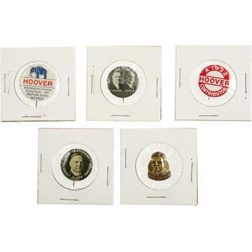 <B><B>Lot Five Herbert Hoover Presidential Campaign Buttons,</B></I></B></I> including: a Hoover-Curtis jugate button and a Hoover bust lapel pin. Various sizes (most 7/8” with the largest 1”). All near fine or better.<BR><BR><BR><BR><b>Shipping:</b> Miscellaneous Collectibles, Smal (<a target="_blank" href="http://www.heritageauctions.com/common/shipping.php">view shipping information</a>)