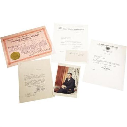 <B>Five Important Labor-Related Signatures,</B></I> as follows:<BR><B>James R. Hoffa,</B></I> Signed Photograph, 5” x 7.25”. Ballpoint autograph in field. Excellent color image with full signature of the high profile teamster boss.<BR><B>Samuel Gompers Document Signed,</B></I> “<I>Saml Gompers</B></I>”, one page, 11” x 8.5”, Washington, D.C., January 26, 1911. AFL commission naming Simon D. Sullivan a District Organizer. Fine condition. Gompers (1850-1924) was one of the AFL's founders back in 1886.<BR><B>John L. Lewis Typed Letter Signed,</B></I> one page on embossed UMW letterhead, 7” x 9” , n.p., March 22, 1940, to Philip W. Porter, Cleveland, Ohio. A brief letter of regret for being unable to make an appearance. Very fine condition. Lewis, President of the United Mine Workers of America from 1940-1960 was the leading labor organizer of his era.<BR><B>David Dubinsky Autograph Card,</B></I> 5” x 3”, n.p, n.d. Accompanied by a secretarial letter on Ladies' Garment Workers Union letterhead and dated November 4, 1971. Excellent condition. Russian immigrant Dubinsky led this important New York-based labor union for over 30 years.<BR><B>Arnold Miller Typed Letter Signed,</B></I> one page on UMW letterhead, Washington, D.C., August 13, 1973. The progressive Miller led the UMWA from 1972 until 1979. Here he promises an autographed photo that is not included. Excellent condition.<BR><BR><b>Shipping:</b> Flat Material, Small (<a target="_blank" href="http://www.heritageauctions.com/common/shipping.php">view shipping information</a>)