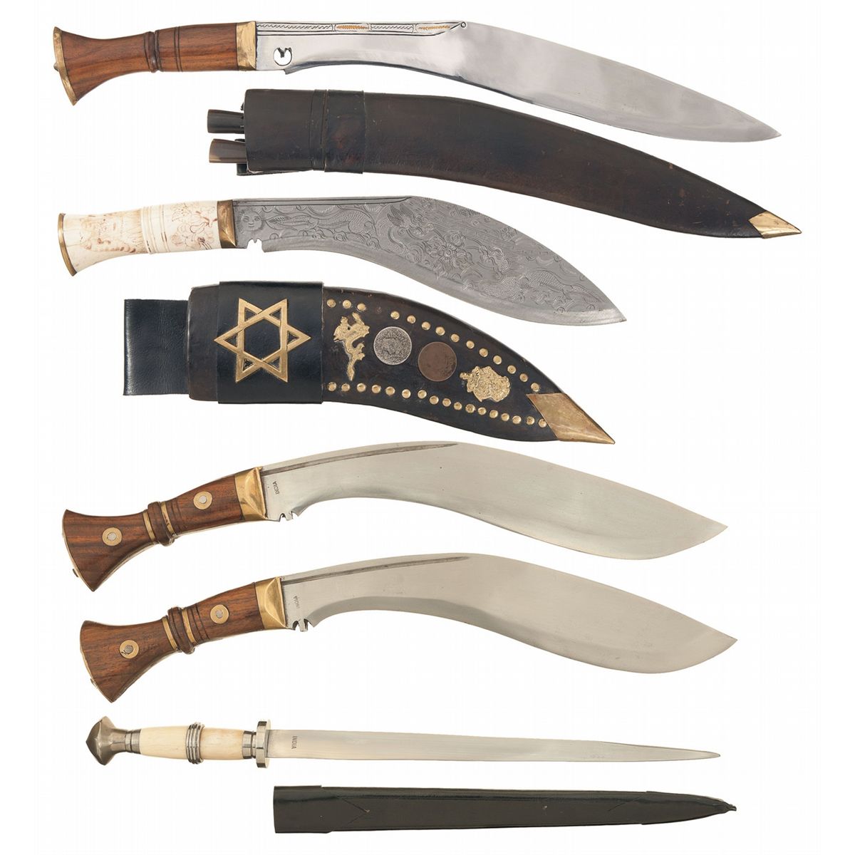 1) Gold accented kukri, 19 1/4" OAL with 14" blade, engraved with gold filled zig-zags on the spine. 2) Engraved and carved kukri, 15 1/4" OAL with extensively engraved 11" blade. 3) Kukri, 18 1/4" OAL with 13" blade. 4) Dagger, 17 1/2" OAL with 12 1/2" straight blade. 5) As 3. (All are good or better overall)