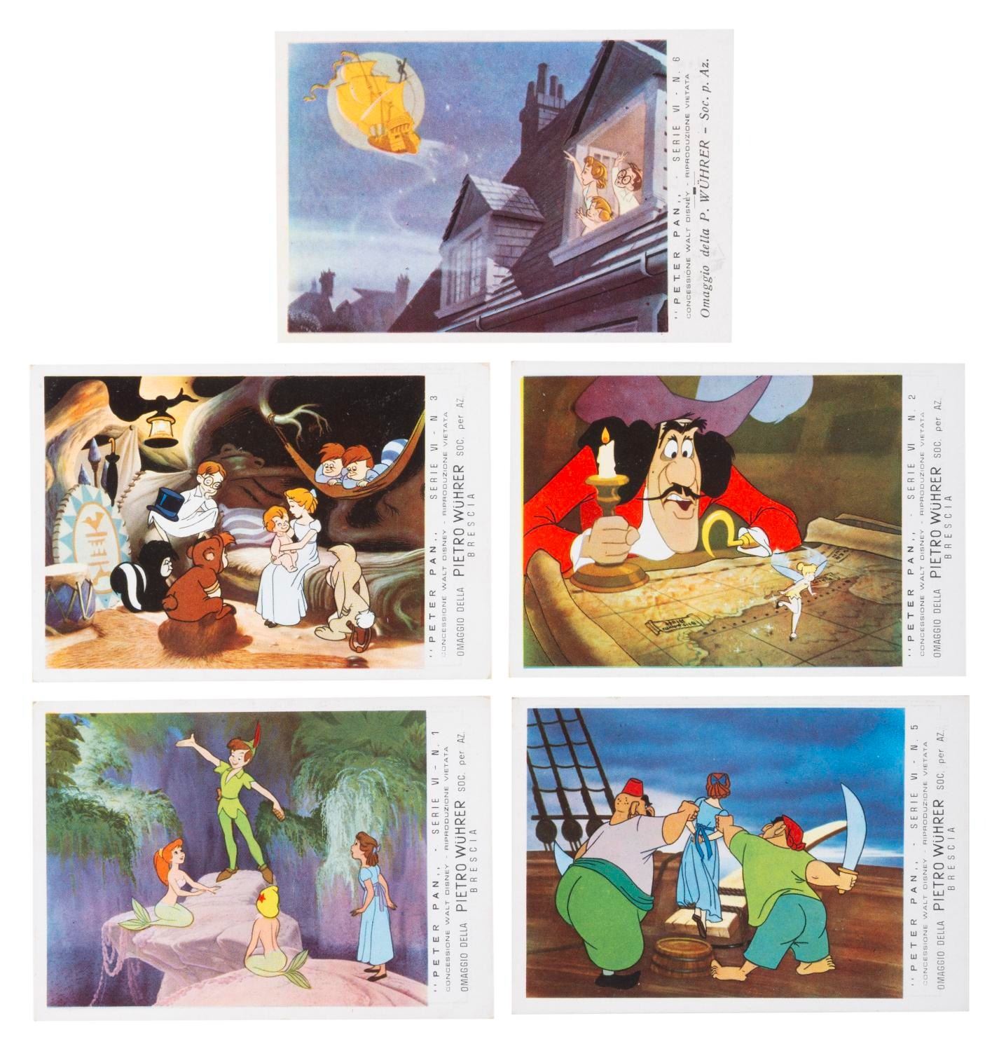 (Disney, 1960s-70s) A collection of five “Peter Pan" cards offered as a premium in Italy with packets of soup bouillon. Each measuring 3" x 4.25" the cards are in very good condition.