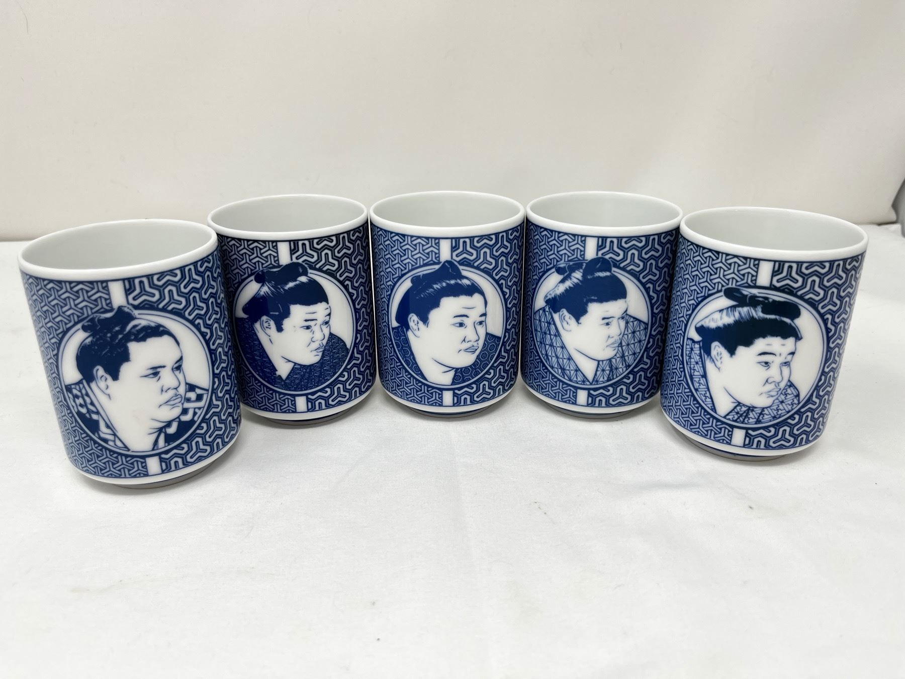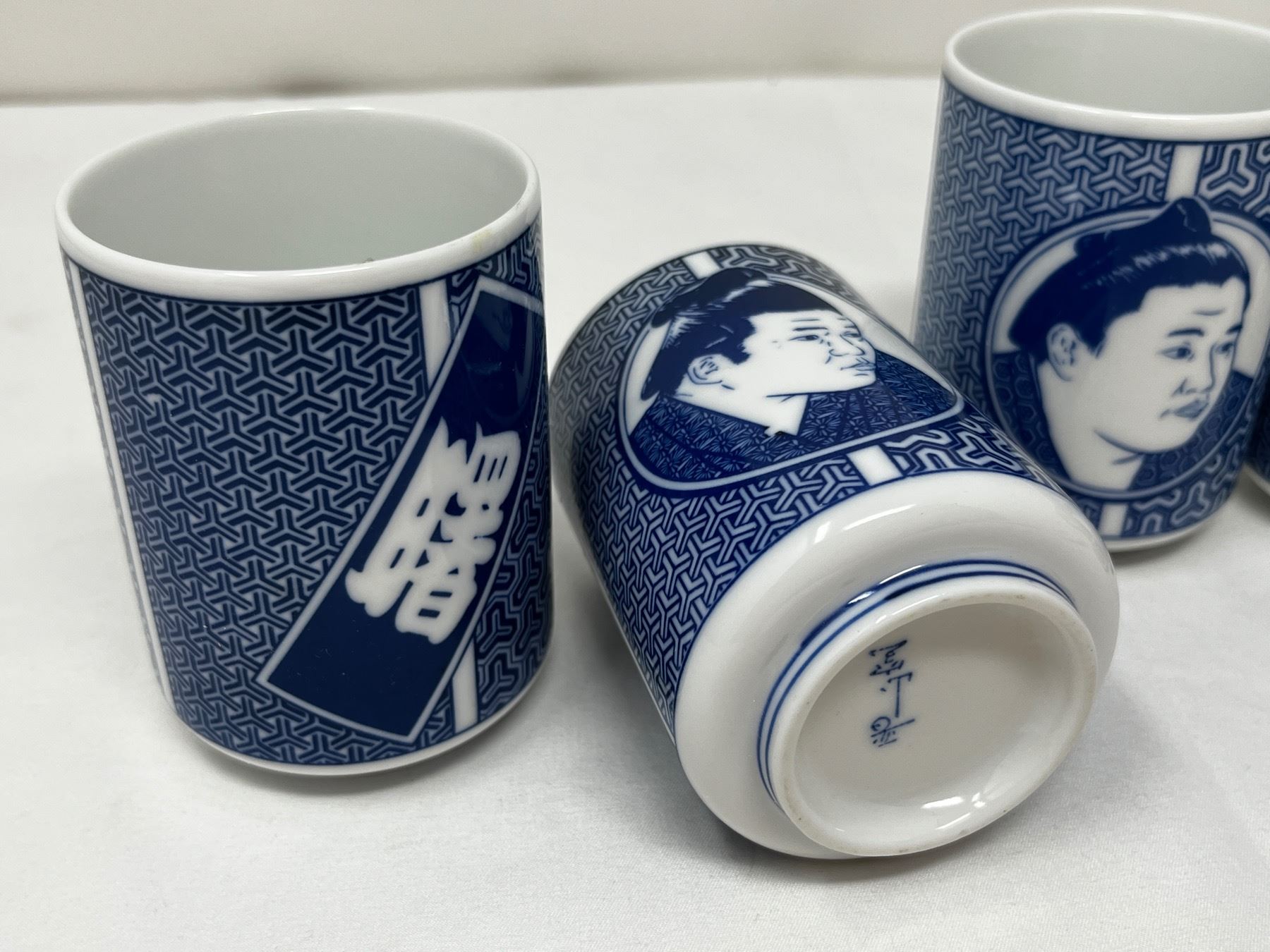Blue porcelean sake cups with sumo wrestler design on front c. 1970's