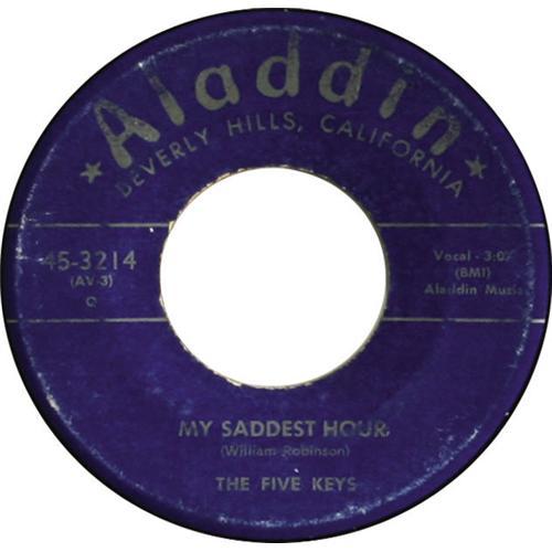 <B>Five Keys "My Saddest Hour"/ "Oh Babe!" 45 (Aladdin 3214, 1953).</B></I> Rare, early single by the long-performing group, prior to their Capitol days. The label is the "flat blue" variety, and our copy some wear, grading at VG 5, but the vinyl is EX 7. <I>From the Rockin' Rev Collection.</B></I><BR><BR><b>Shipping:</b> Recordings (<a target="_blank" href="http://www.heritageauctions.com/common/shipping.php">view shipping information</a>)