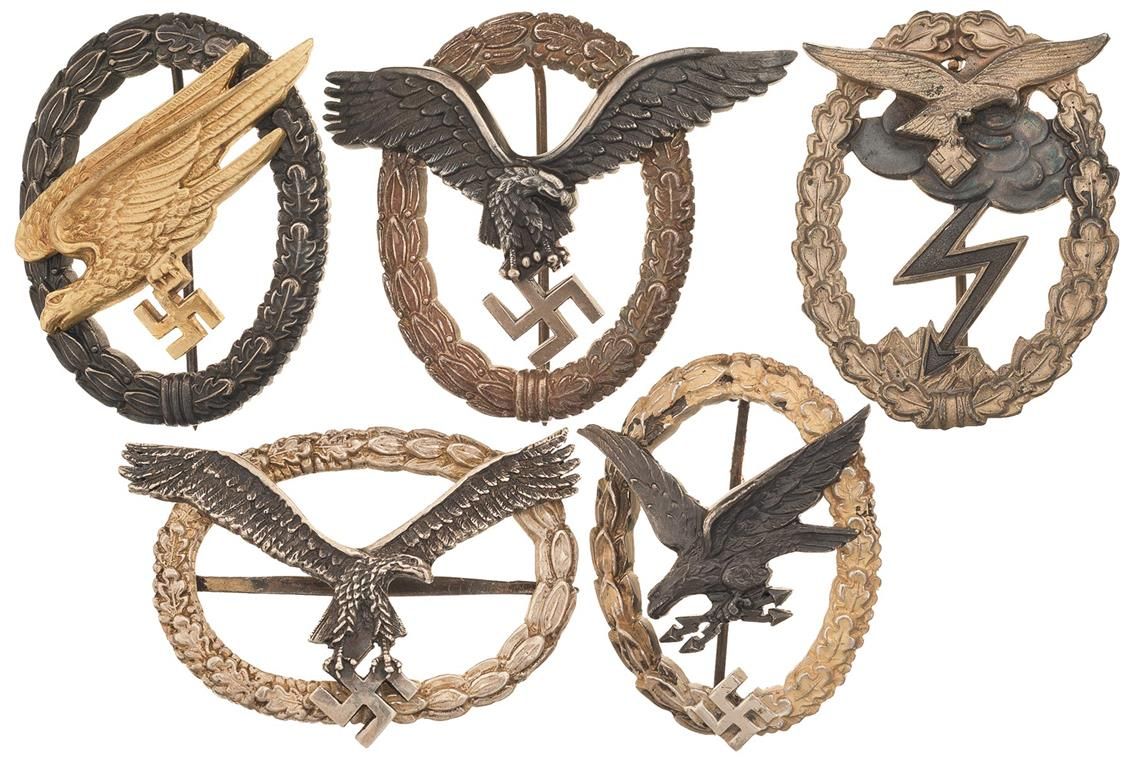1) Aircrew Badge, 2 3/8 inches wide, with a nickel flat oval wreath and "CEJ/800" on the back of the silver eagle. 2) Ground Assault Badge, 2 1/4 inches long, with "G.B." on the back. 1-piece construction with blackened storm cloud. 3) Paratrooper Badge, 2 1/8 inches long with "GH OSANG/DRESDEN" on the back of the gilt eagle, and a darkened silver wreath. 4) Radio Operator Badge, "WDEUMER/LUDENSCHEID" on the back of the tombak eagle, with a nickel wreath. 5) Pilot Badge, 2 1/2" wide with "WDEUMER/LUDENSCHEID" on the eagle.