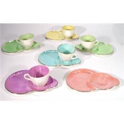 Five Maling teacups and six cake plates decorated in iridescent blues, pinks, purples, yellows and greens, marks to bases