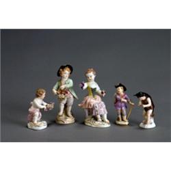 Five Meissen Figures, Late 19th-Early 20th Century, Consisting of a boy holding a basket of f...