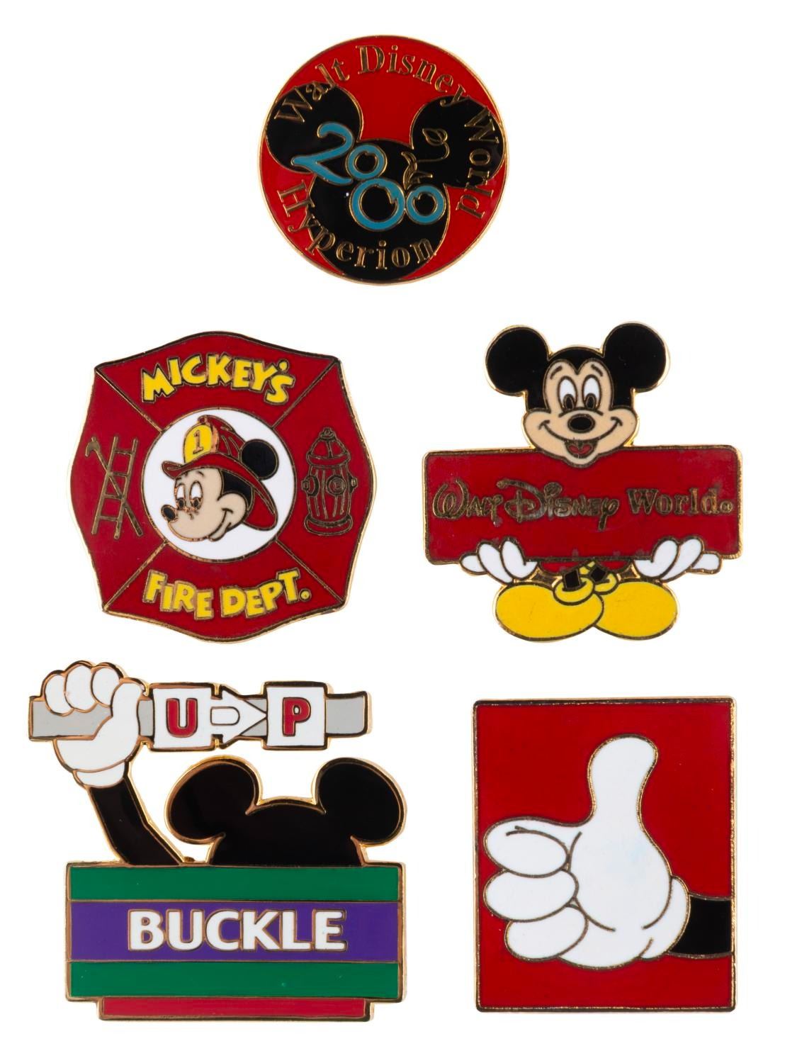 (Walt Disney World, 2000) A collection of five Mickey Mouse pins released in 2000 at Walt Disney World. Included is a "Hyperion” pin only available with purchase of a pin book, thumb’s up, Fire Department, Buckle Up, and Walt Disney World sign. The pins are in very good condition.