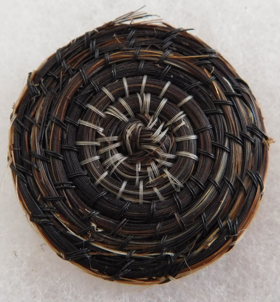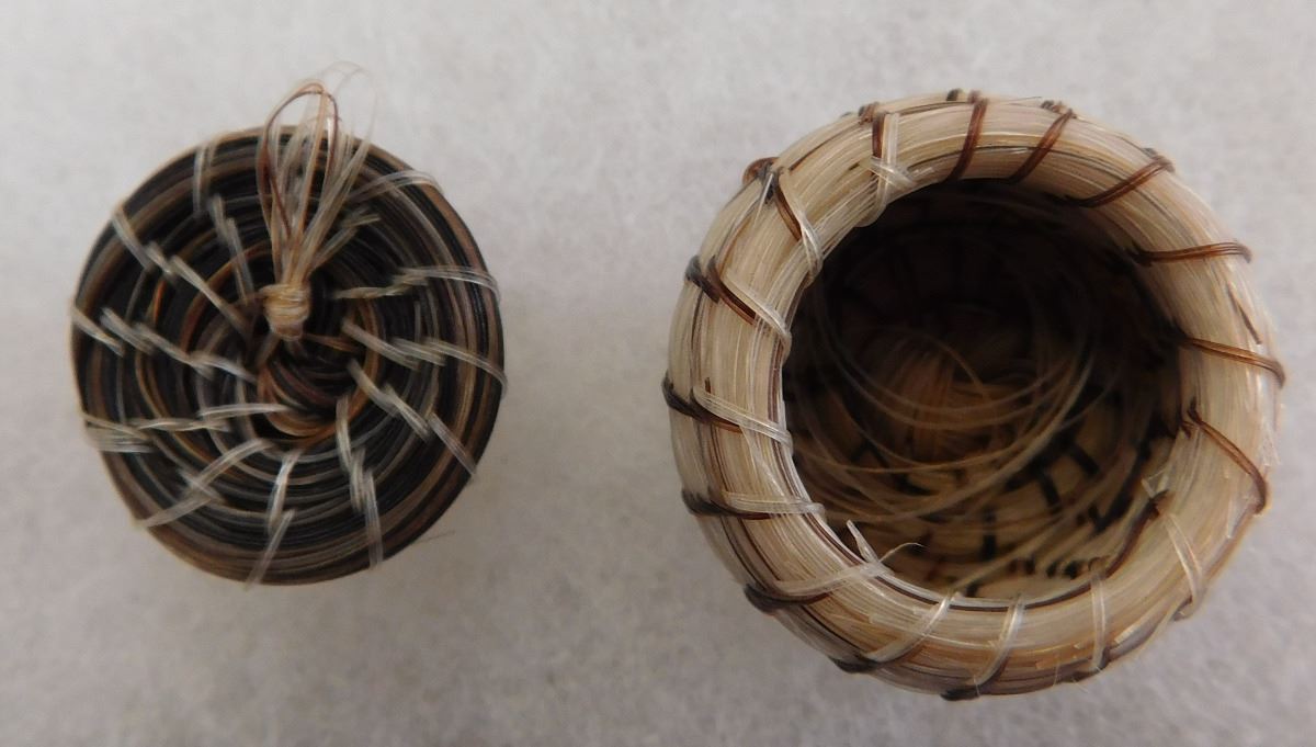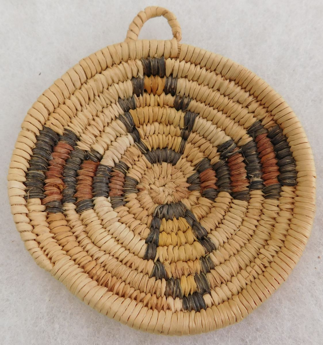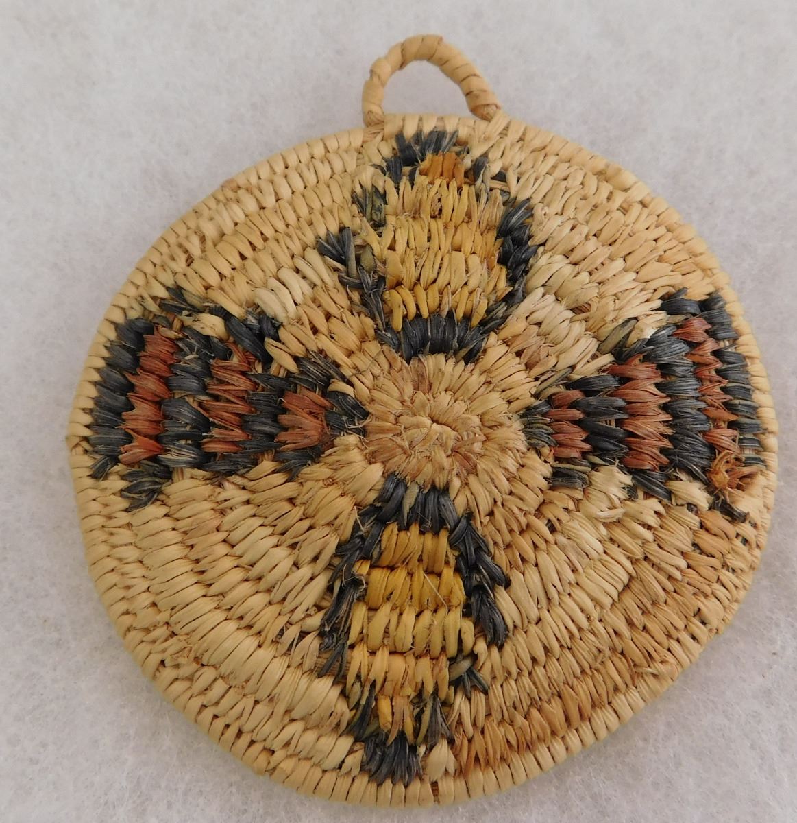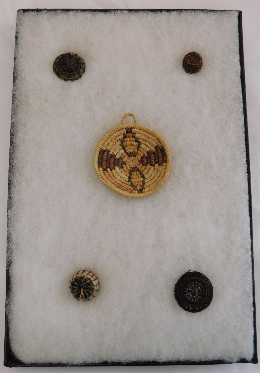 Five nice miniature baskets from Arizona. This items are made from horse hair and yucca and measure 1 to 1/2 inches. They are believed to be Pima - Hopi. Good condition Shipping: $16.00 These items came from long time collector in the San Diego area. Frame not included.