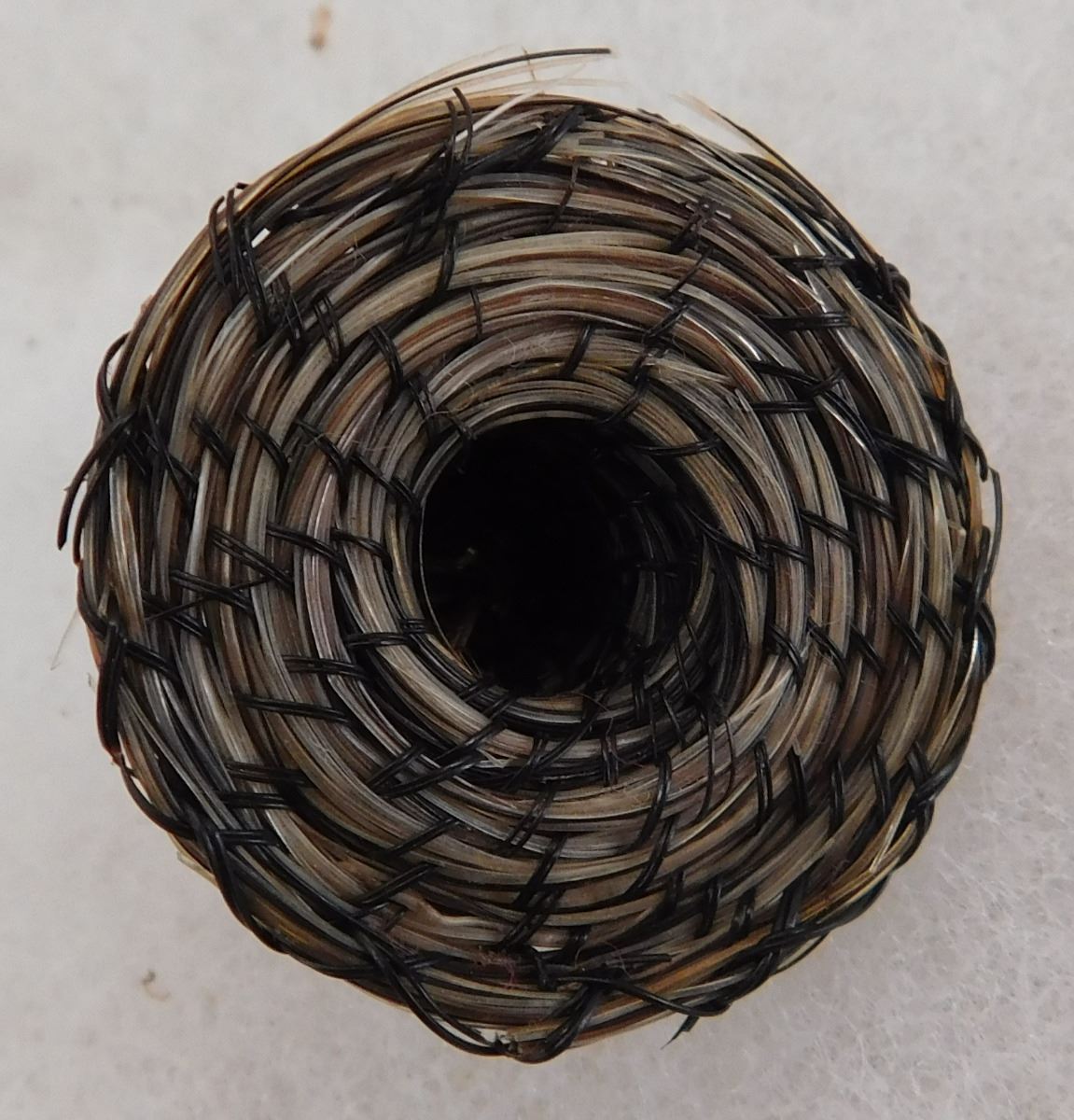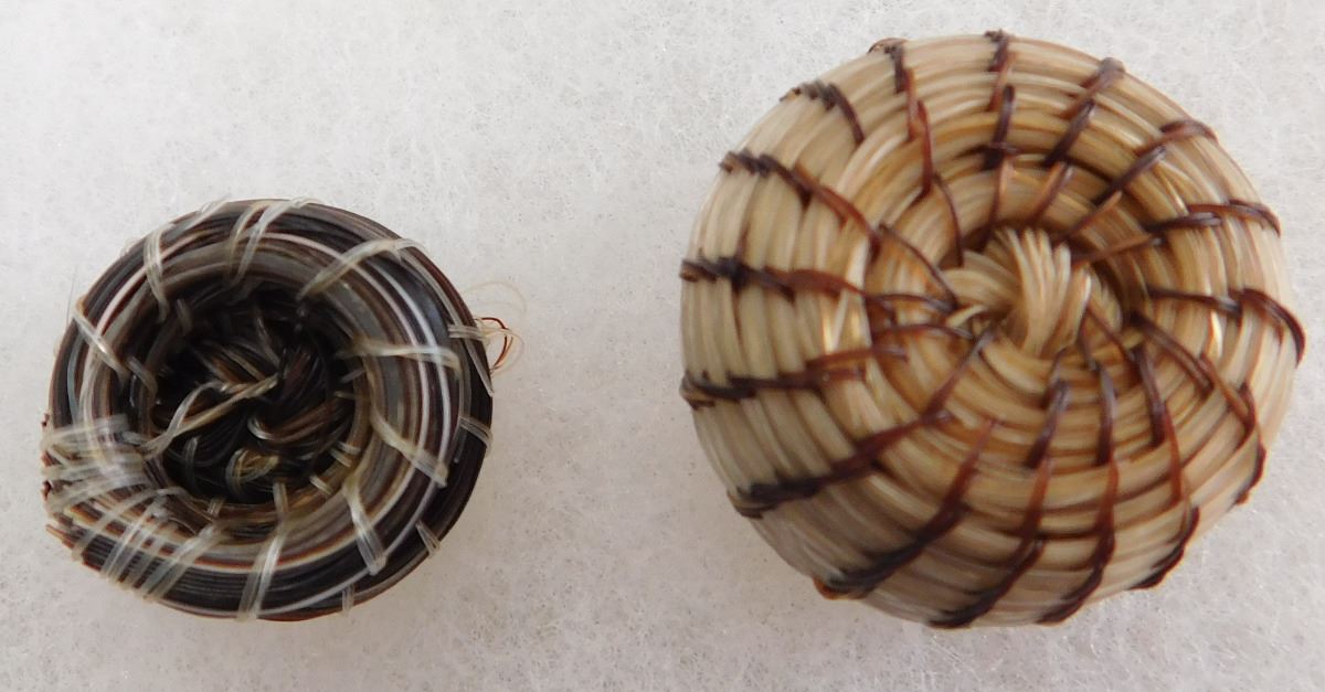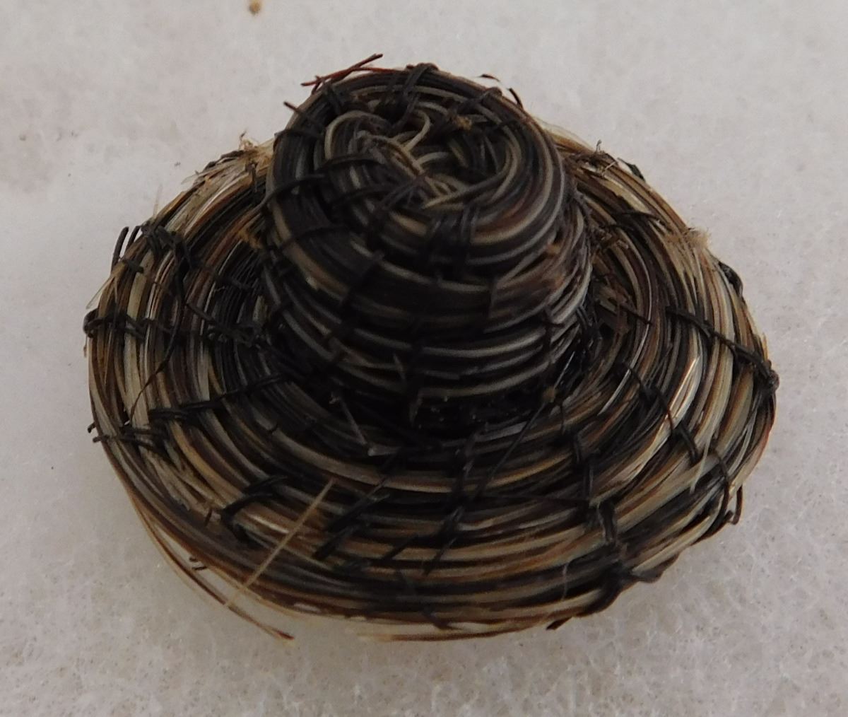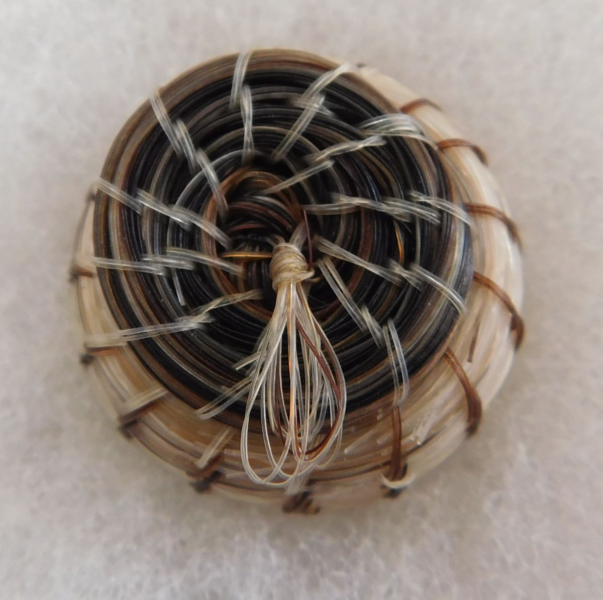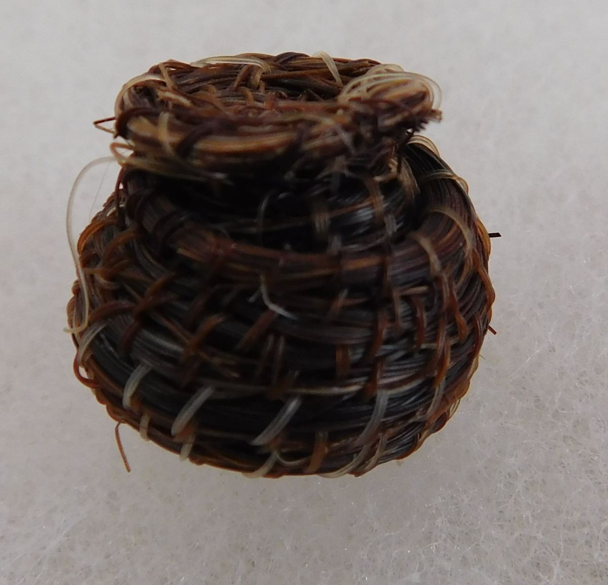 Five nice miniature baskets from Arizona. This items are made from horse hair and yucca and measure 1 to 1/2 inches. They are believed to be Pima - Hopi. Good condition Shipping: $16.00 These items came from long time collector in the San Diego area. Frame not included.