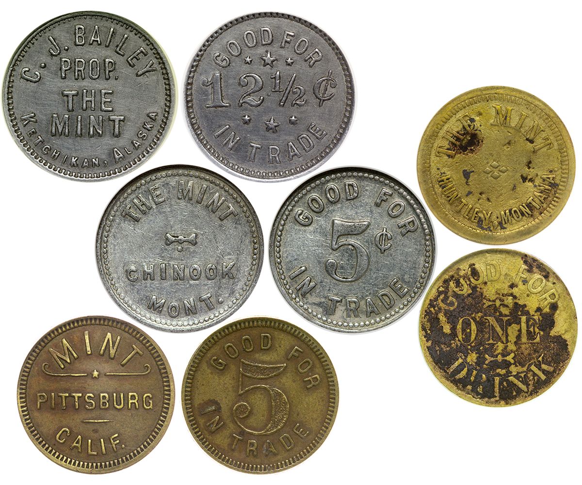 c1900 This is a lot of five tokens from Mint Saloons in CA, AK, and three from MT. - HKA#65724