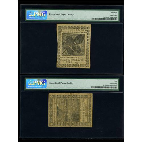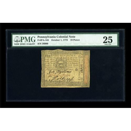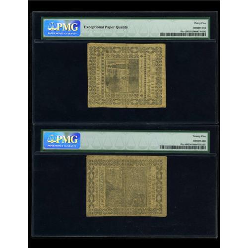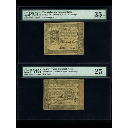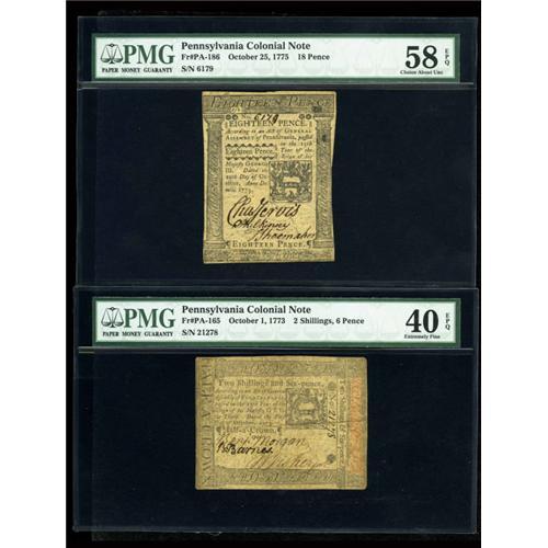 <B>Five Moderately Circulated Pennsylvania Issues.</B></I> <B><BR>March 20, 1773 4s PMG Choice Very Fine 35 EPQ,<BR>October 1, 1773 18d PMG Very Fine 25,<BR>October 1, 1773 2s6d PMG Extremely Fine 40 EPQ<BR>October 1, 1773 5s PMG Very Fine 25,<BR>and a October 25, 1775 18d PMG Choice About Unc 58 EPQ.</B></I><BR>This group is perfectly original with pleasing, problem-free paper exhibited on every note.<BR><BR><b>Shipping:</b> Coins & Currency (<a target="_blank" href="http://www.heritageauctions.com/common/shipping.php">view shipping information</a>)