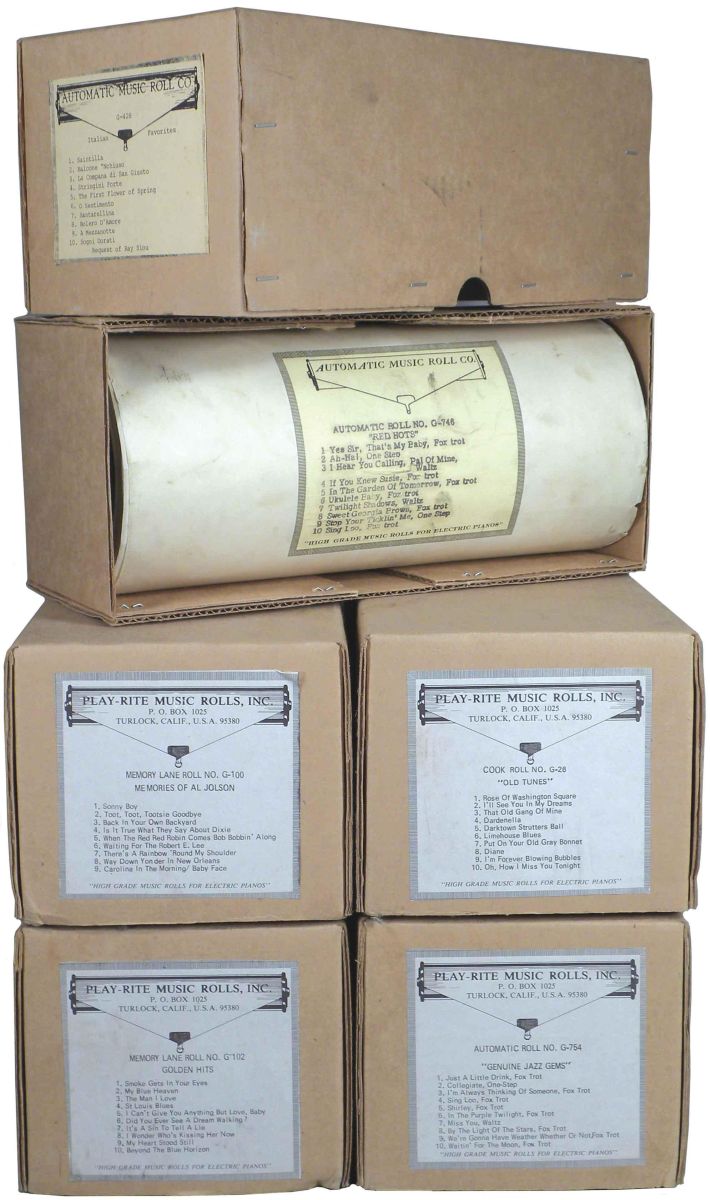 Lot of Five Music Rolls. Automatic Music Roll Company. Unused in original box. 11 1/4 inches wide.